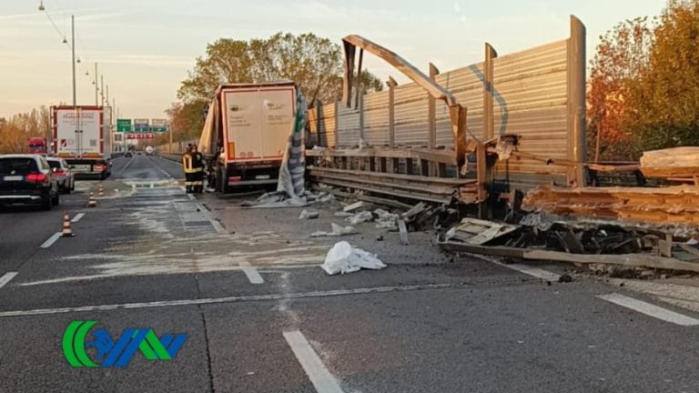 Tir si schianta contro le barriere e perde carburante: traffico in tilt verso Milano