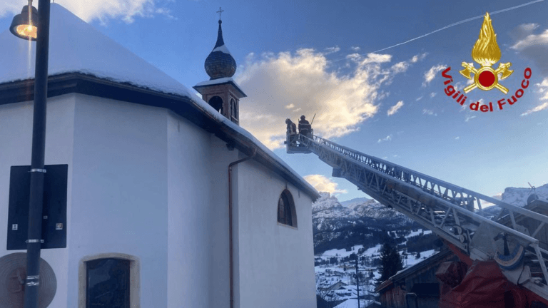 Troppa neve sul tetto della chiesa: lo “sgombero controllato” dei Vigili del fuoco