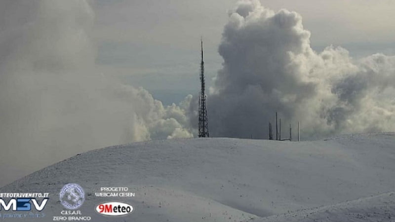 Meteo, neve d’aprile sulle vette dell’Alta Marca: imbiancati Monte Cesen, Grappa e Col Visentin