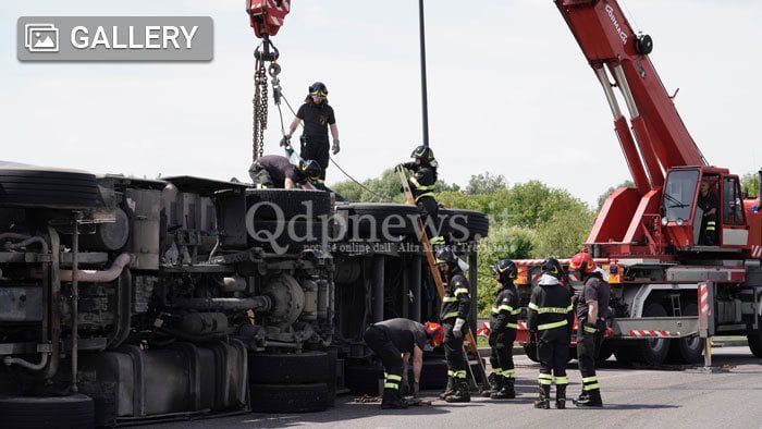 San Vendemiano, camion si rovescia sulla rotonda all’ingresso dell’autostrada: sul posto Vigili del fuoco e forze dell’ordine