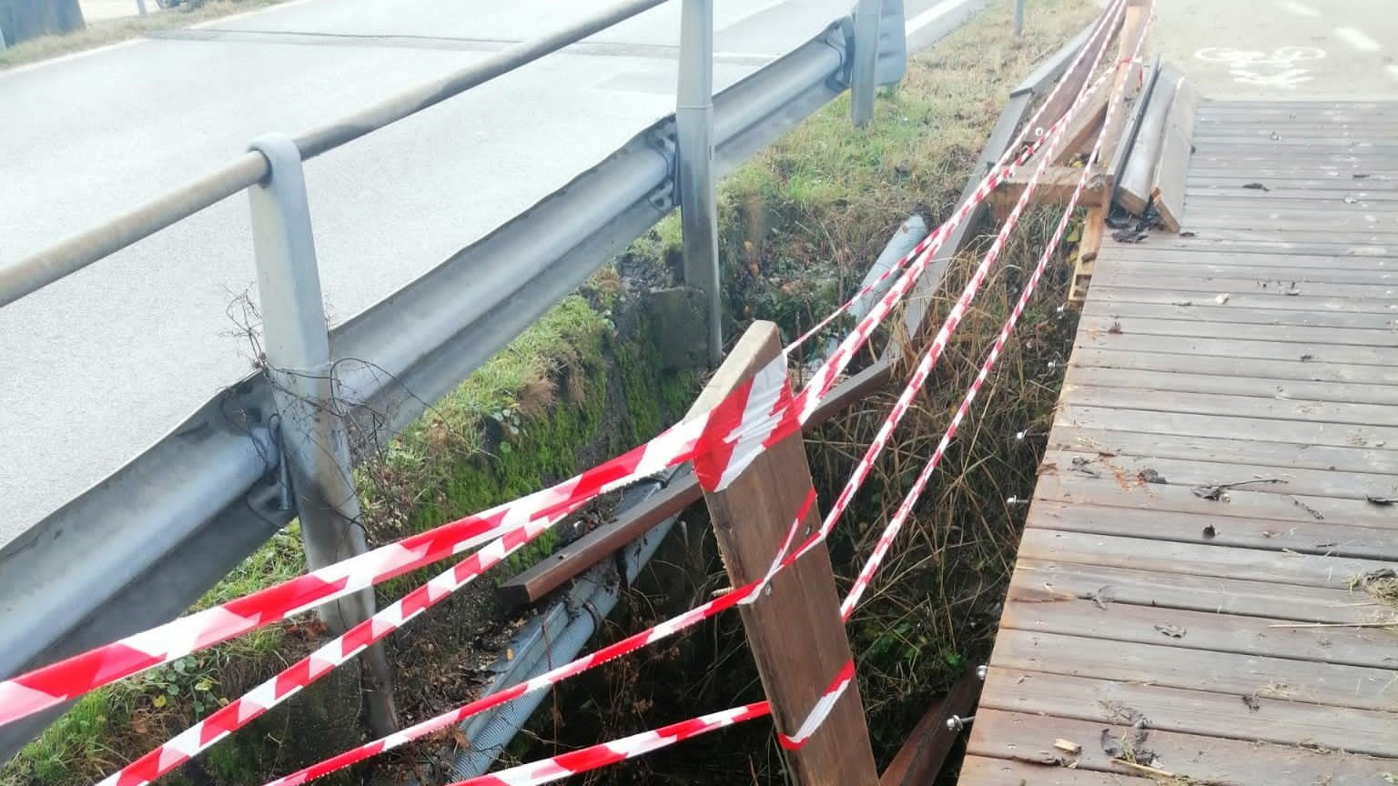 Il parapetto di una passerella ciclopedonale distrutto e un semaforo a penzoloni: primo dell’anno da “conta dei danni” per l’amministrazione comunale…