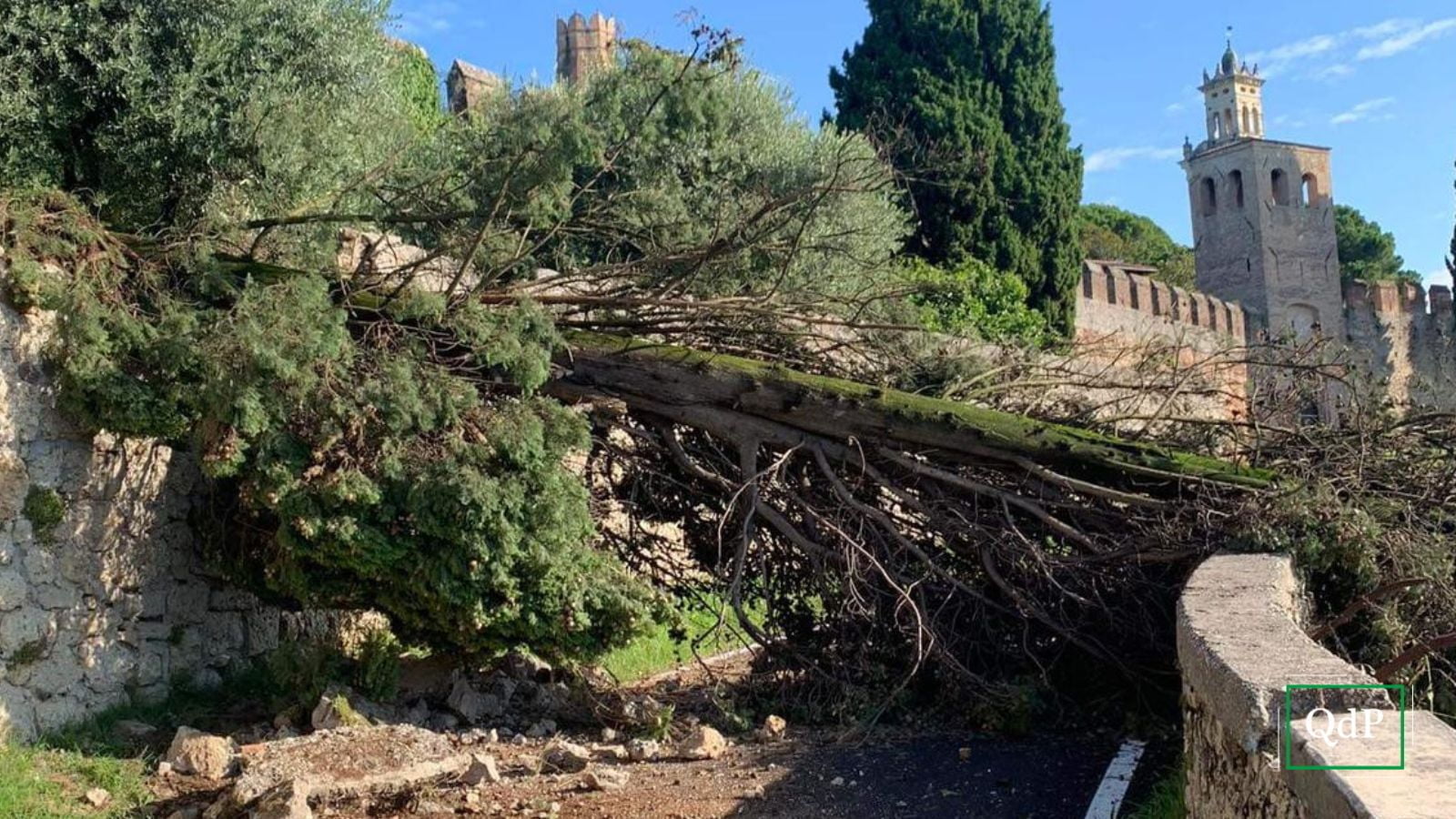 Abbattuto il cipresso del Castello di San Salvatore, danni al muro di cinta