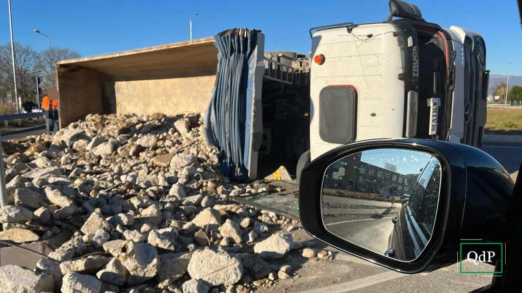 Camion colmo di pietre si rovescia alla rotonda sulla Feltrina