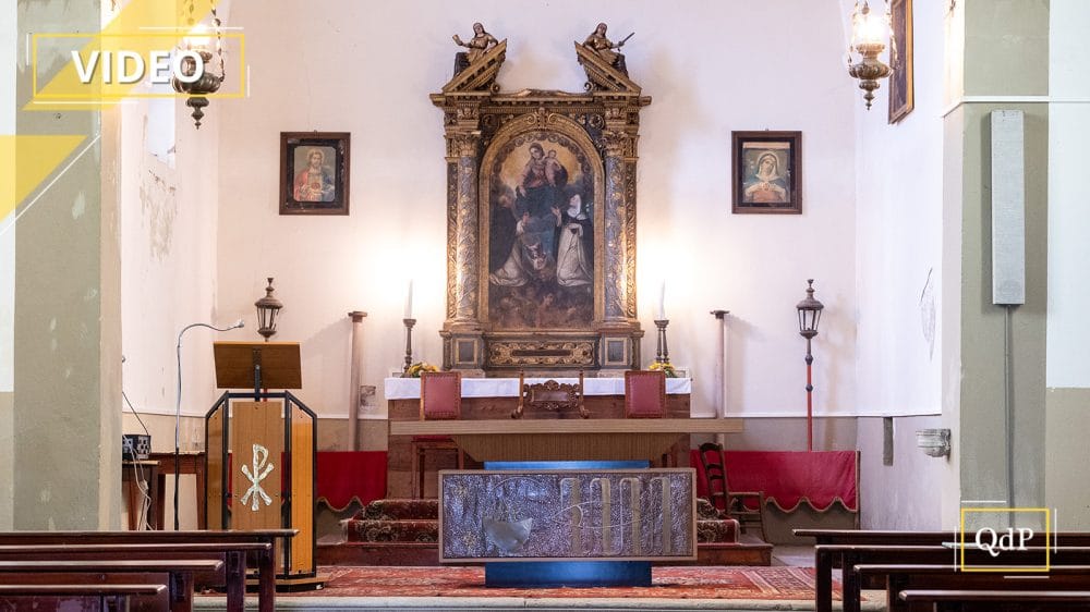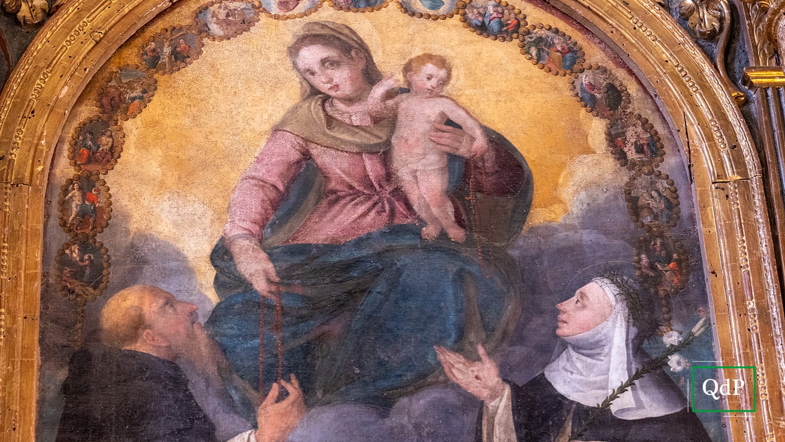 Su di un banco di turgide nubi la Vergine e il Bimbo sono raffigurati nell’atto di consegnare la corona del Rosario rispettivamente a san Domingo di Guzman e santa Caterina da Siena. Le anime del Purgatorio nei bagliori del fuoco invocano a gran voce i misericordiosi suffragi di coloro che sono ancora nel mondo. Il messaggio insito nel testo figurativo consiste dunque nel sollecitare i vivi alla confidente preghiera, la quale proprio per l’intercessione della Vergine si trasforma in atto di autentica carità (rappresentata simbolicamente dalla discesa della luminosa figurina dell’Angelo Liberatore) verso quei defunti che necessitano della purificazione per essere immessi nell’eterna beatitudine (F. Vizzutti).