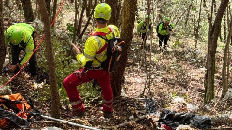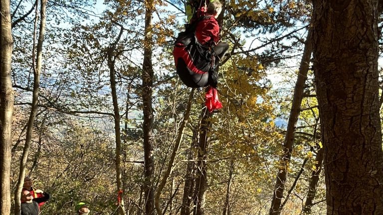 Pilota di parapendio sospeso su un albero e salvato con la “teleferica”