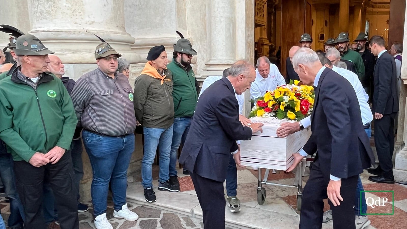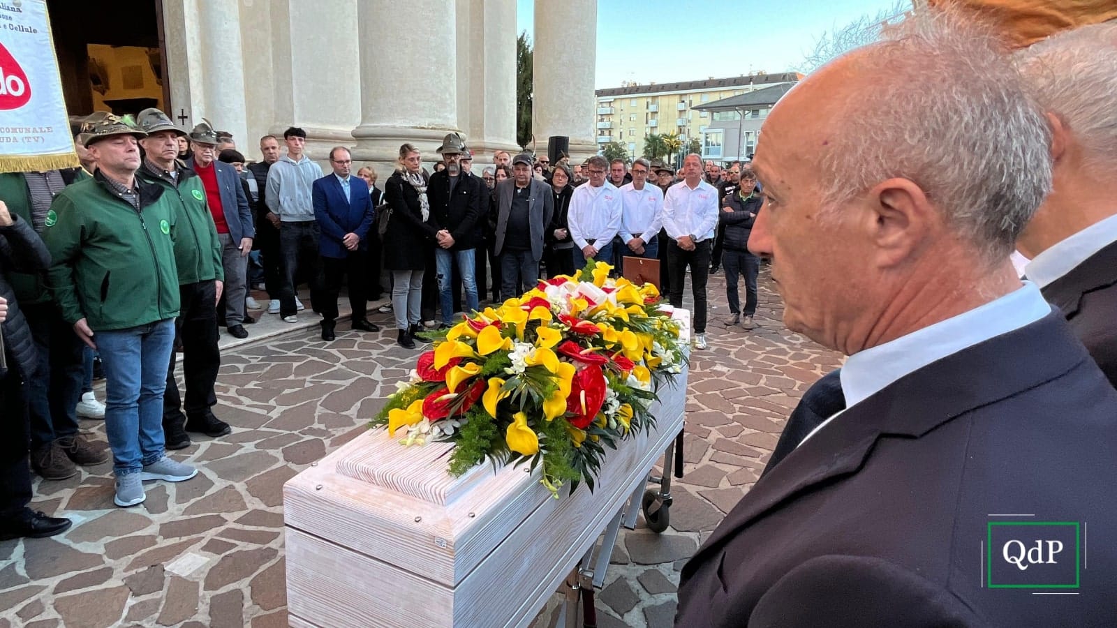 Verso la fine delle esequie, il saluto con le preghiere del Donatore, quella degli Artiglieri d’Italia e, infine, il “Signore delle Cime”. Poi l’uscita del feretro, accompagnato sul sagrato dalla canzone dei Nomadi “Ti lascio una parola (Goodbye)” e da un lungo commosso applauso. Prima degli abbracci, delle condoglianze ai suoi cari, delle lacrime e di quella maglia stesa sul feretro dagli Amici del Rugby club Trevisan.
