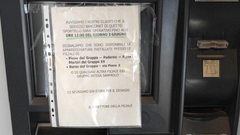 Trovarsi tra Pieve del Grappa, Castelcucco e Possagno e dover prelevare del contante sembra poter diventare un’impresa e per verificarlo di persona abbiamo tentato di prelevare venti euro da uno sportello qualsiasi in due giornate diverse, un lunedì mattina e un venerdì pomeriggio, per evitare le “eccezionalità” dei malfunzionamenti.