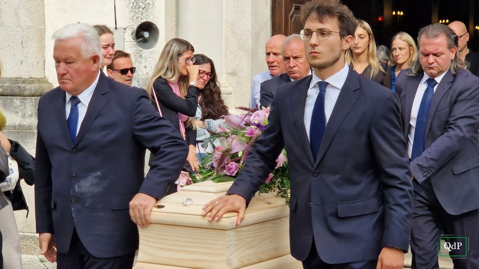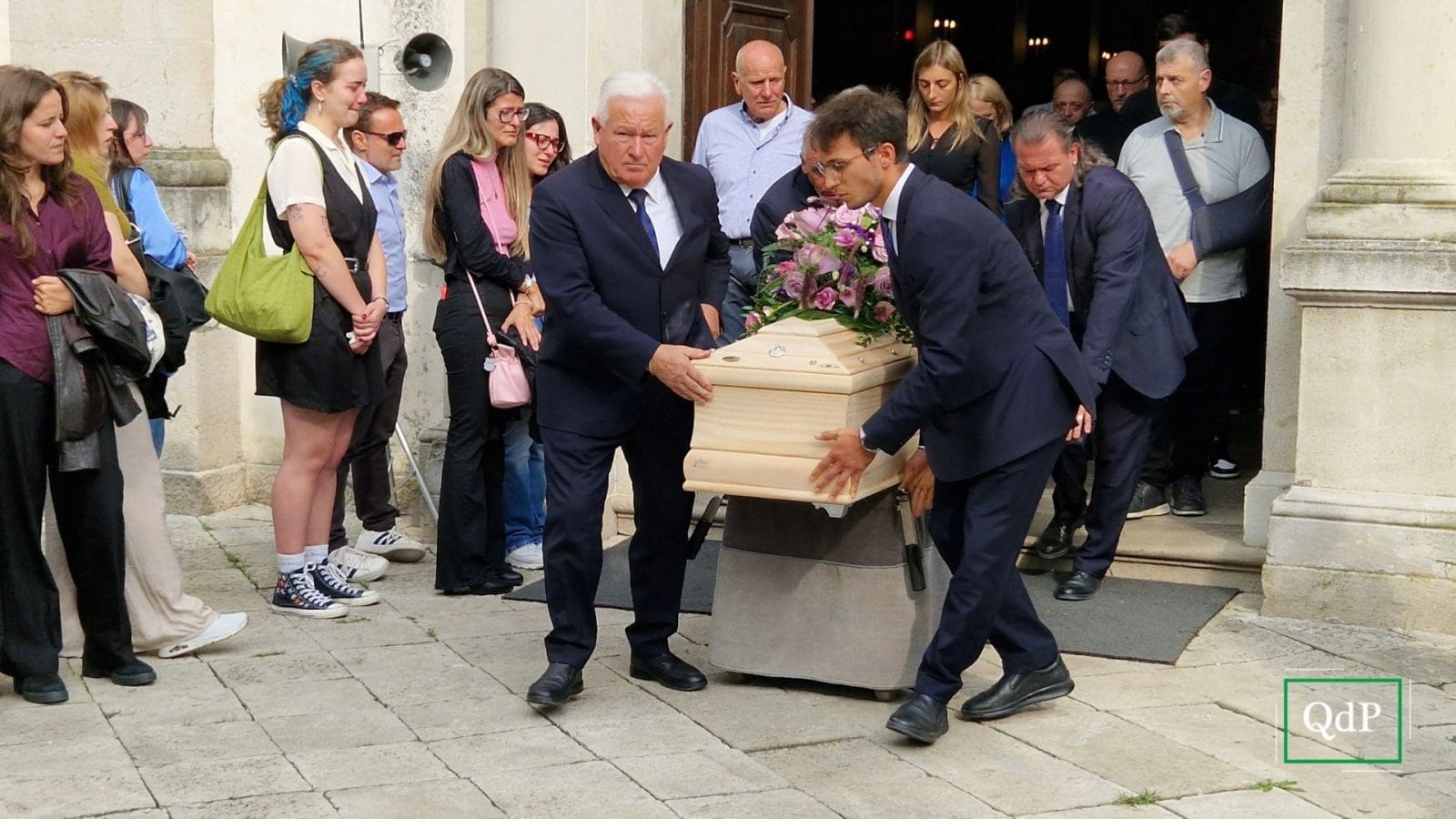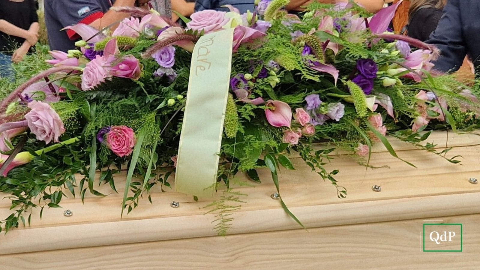 La bara di legno chiaro, con sopra un tappeto di fiori lilla, è quindi uscita dalla chiesa, nel cordoglio di tutti.
