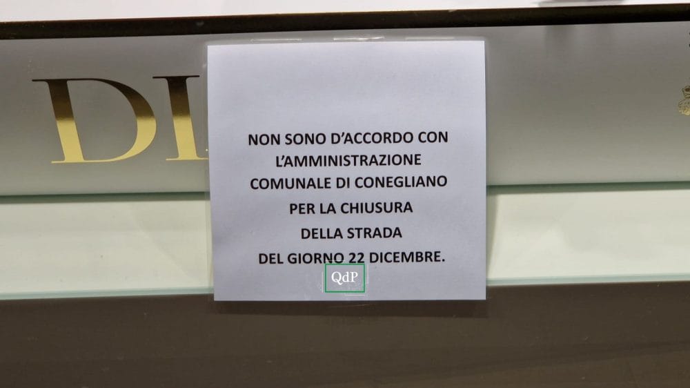 “Non sono d’accordo con l’amministrazione comunale di Conegliano per la chiusura della strada del giorno 22 dicembre”: è il messaggio leggibile in un cartello che inizia a campeggiare in alcune vetrine del centro cittadino.