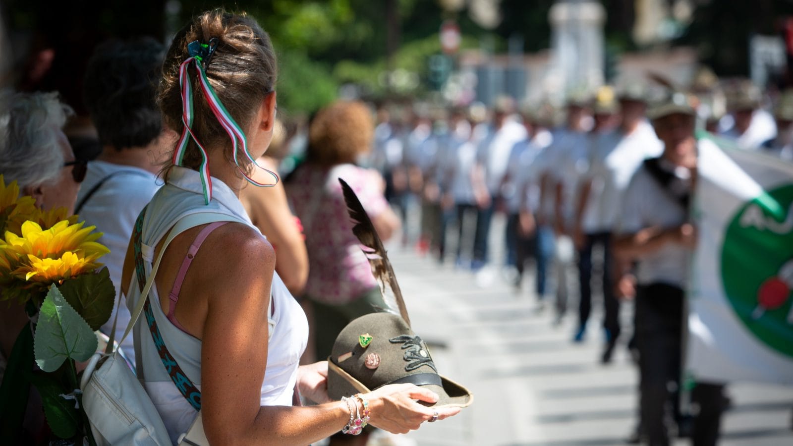 Un gesto carico di amore e di memoria: una figlia, con il cappello alpino del padre defunto, rende omaggio al Centenario. L’immagine cattura con sensibilità ed eleganza questo momento di profonda intimità e carico di simboli, restituendo un senso di serenità silenziosa e di legame valoriale eterno tra generazioni.