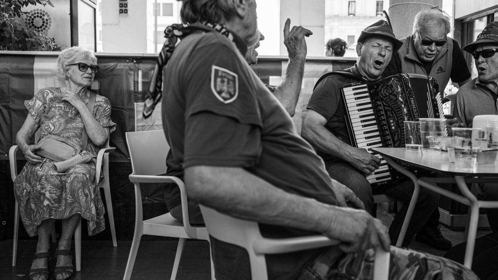 Uno degli aspetti più autentici di ogni adunata alpina è la convivialità, un valore vissuto e condiviso non solo dagli Alpini, ma anche da chi Alpino non è. La scelta del bianco e nero valorizza lo scatto, mettendo in risalto i piccoli gesti e i dettagli che raccontano la profondità e la spontaneità del momento.