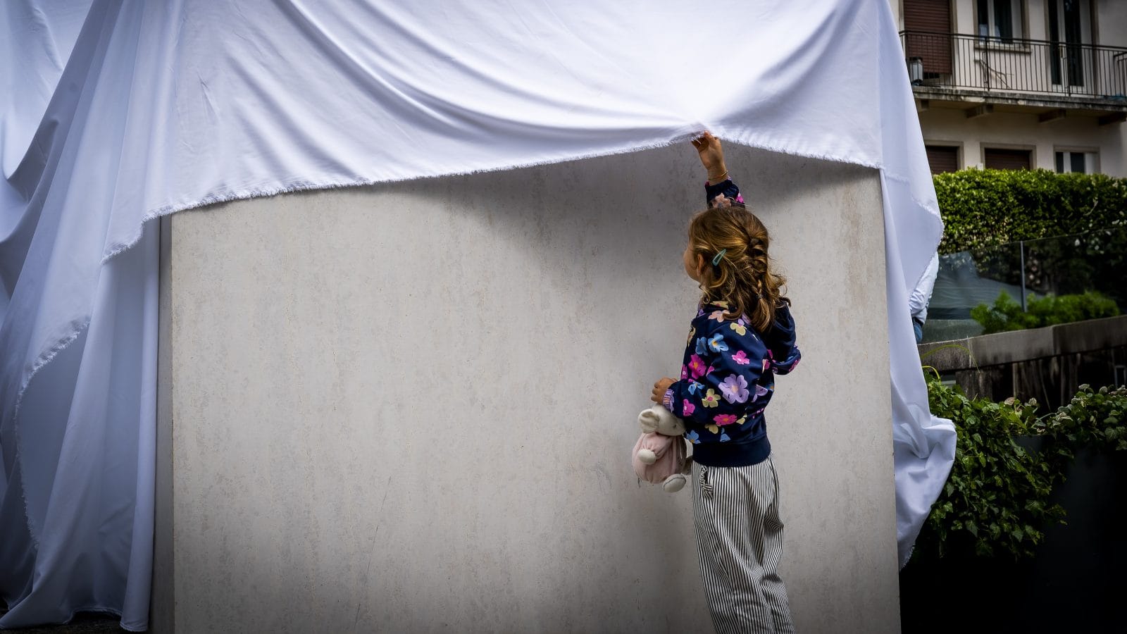 L’immagine ha una composizione raffinata ed elegante, che congela un istante prezioso di innocente meraviglia: una bambina sbircia con curiosità il Monumento agli Alpini, poco prima della sua inaugurazione. Uno scatto che riflette la promessa del futuro impegno, la memoria collettiva scolpita nella pietra, che sta per diventare patrimonio di tutti.