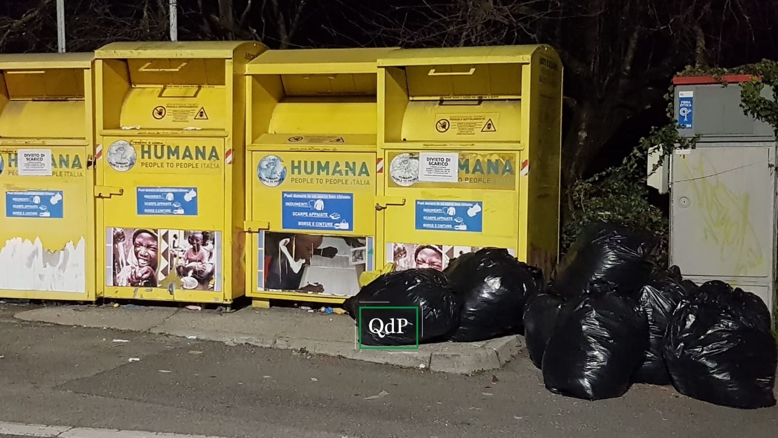 Passando all’incrocio tra le vie Ortigara e Podgora, a Parè, è possibile notare alcuni sacchi neri dell’immondizia scaricati a lato dei quattro contenitori dell’Humanitas adibiti alla raccolta di indumenti usati, poi donati ai bisognosi.
