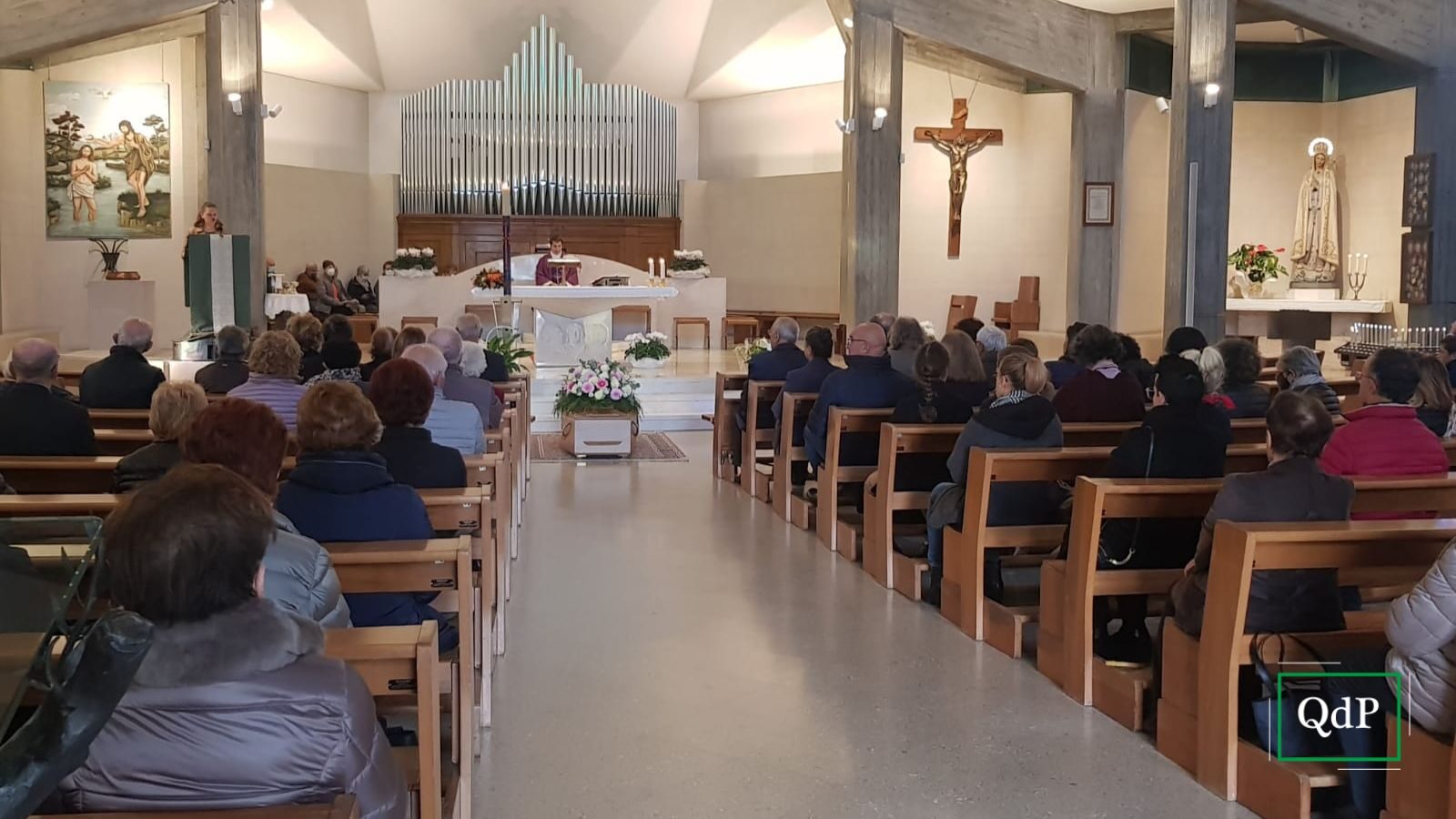 Il funerale è iniziato alle 15, dopo il Santo Rosario, e nella chiesa della Beata Vergine Maria di Fatima la comunità ha rivolto il proprio pensiero alla bara di legno chiaro cosparsa di fiori rosa, bianchi e gialli, che era stata collocata ai piedi dell’altare.