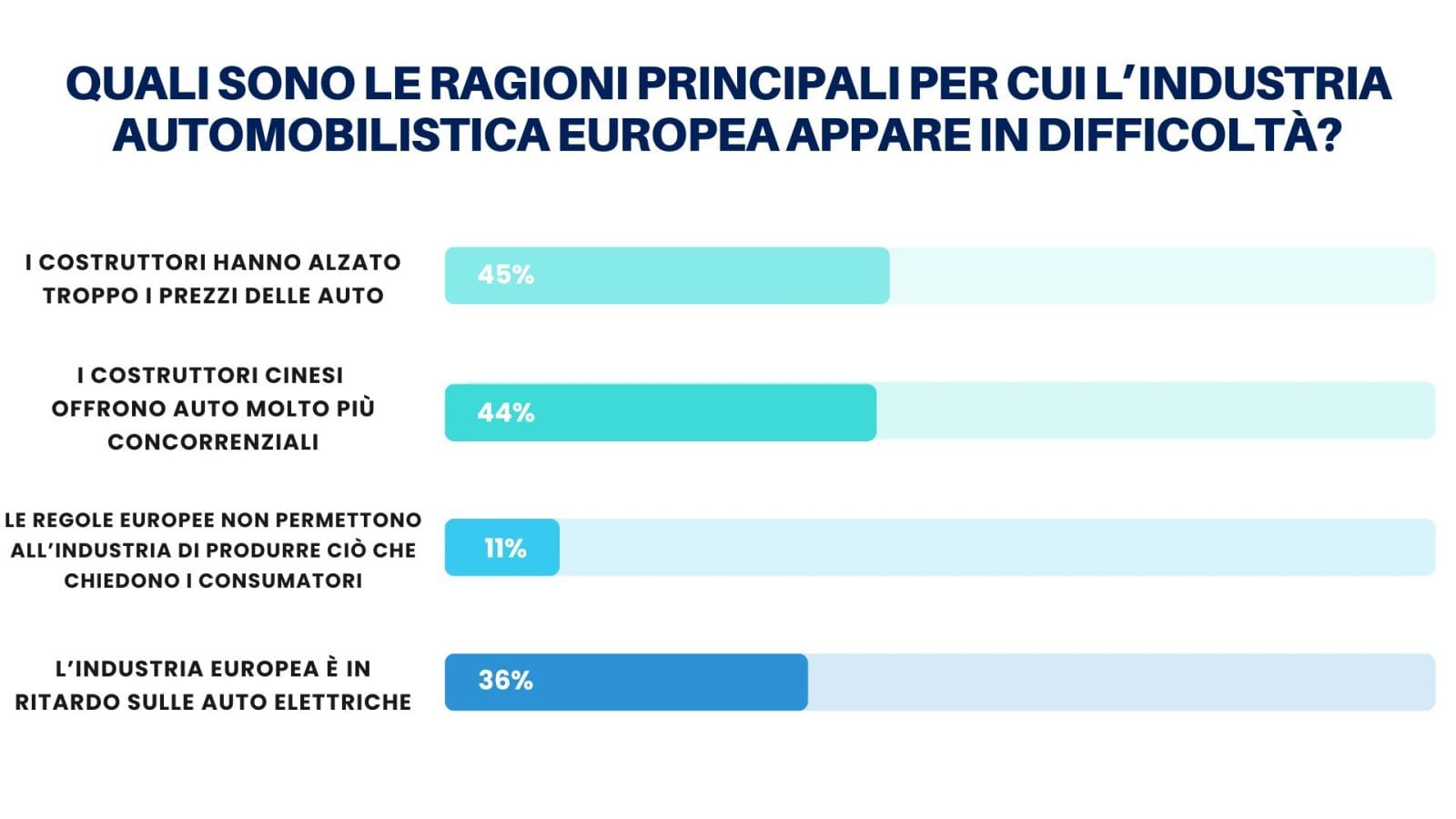 Dai dati emerge che gli italiani individuano quattro principali ragioni alla base delle difficoltà dell’industria automobilistica europea: