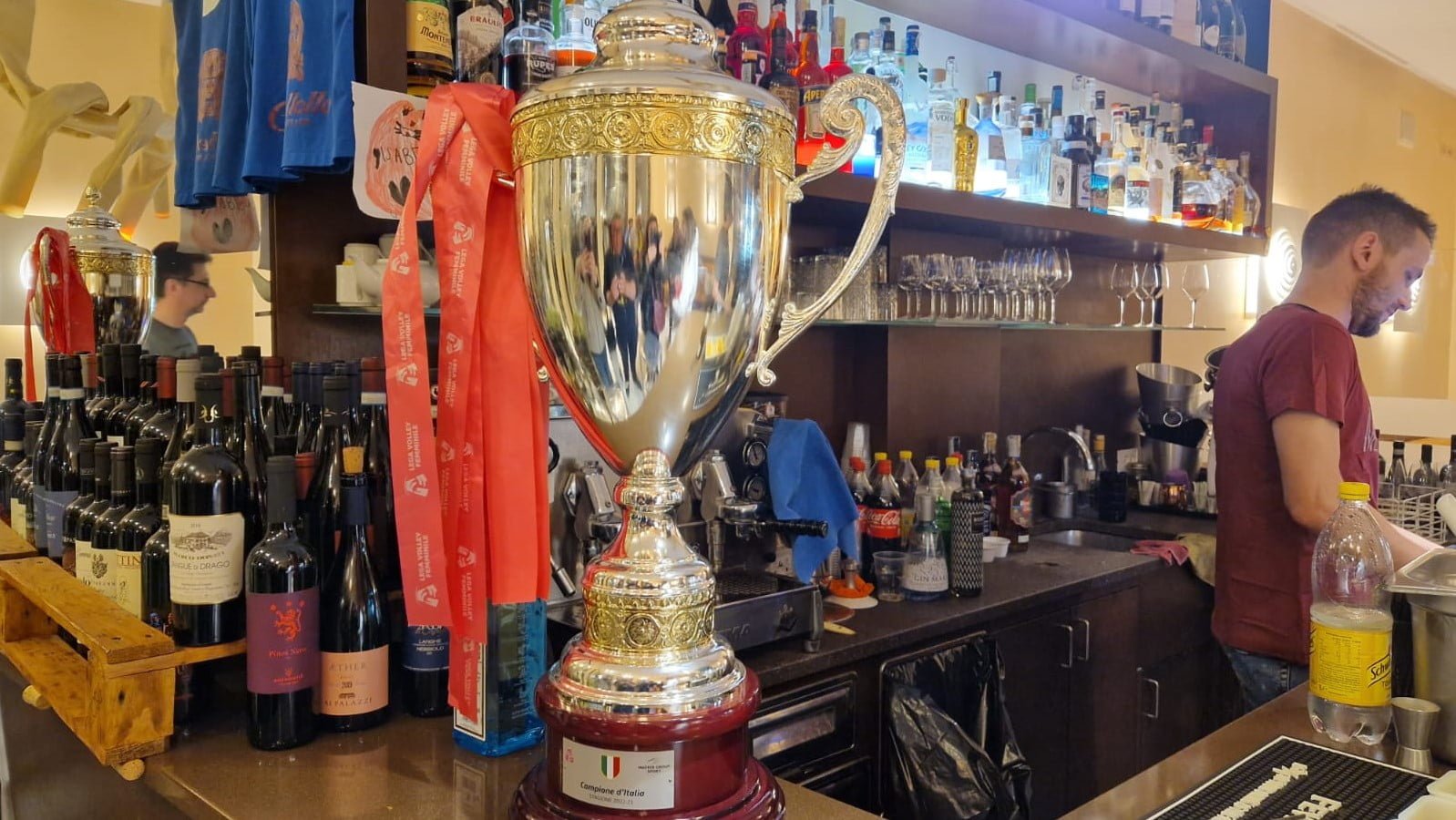Una volta uscito dalla sua auto, ha portato la Coppa delle Campionesse d’Italia all’interno del locale, mentre un coro di tifosi intonava “I campioni dell’Italia siamo noi” reggendo il Tricolore. Ad aumentare l’emozione il brano musicale “Notti magiche”, storica canzone di Gianna Nannini ed Edoardo Bennato.