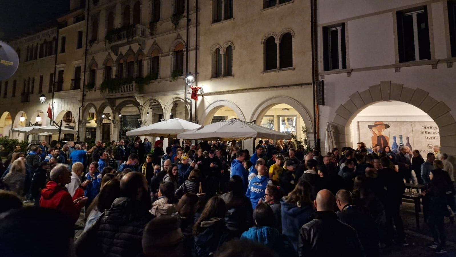 Il Mezzosale, locale di via XX Settembre, già alle 23.45 di lunedì aveva iniziato ad allestire lo scenario della grande festa a Conegliano, con una presenza discreta di Forze dell’ordine nelle vicinanze.