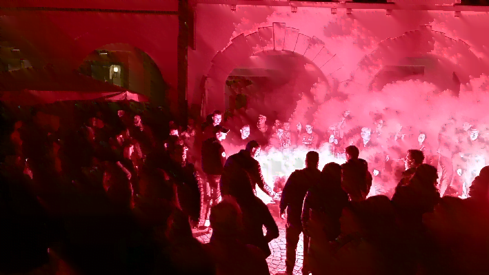 Suggestivo e scenografico l’arrivo di alcuni tifosi con fumogeni e torce rosse, che hanno “infiammato” la via alzando ulteriormente l’entusiasmo della platea.