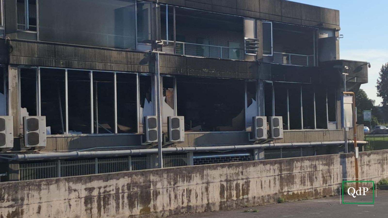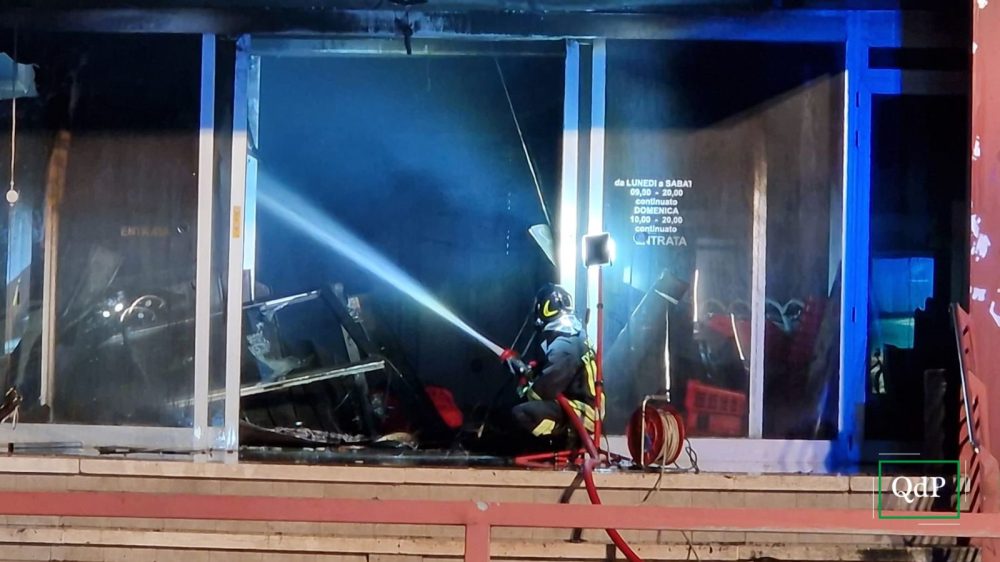 A terra, vicino allo stabile, sono ancora visibili diversi vetri, derivanti dalle porte e dalle vetrine colpite dall’incendio.