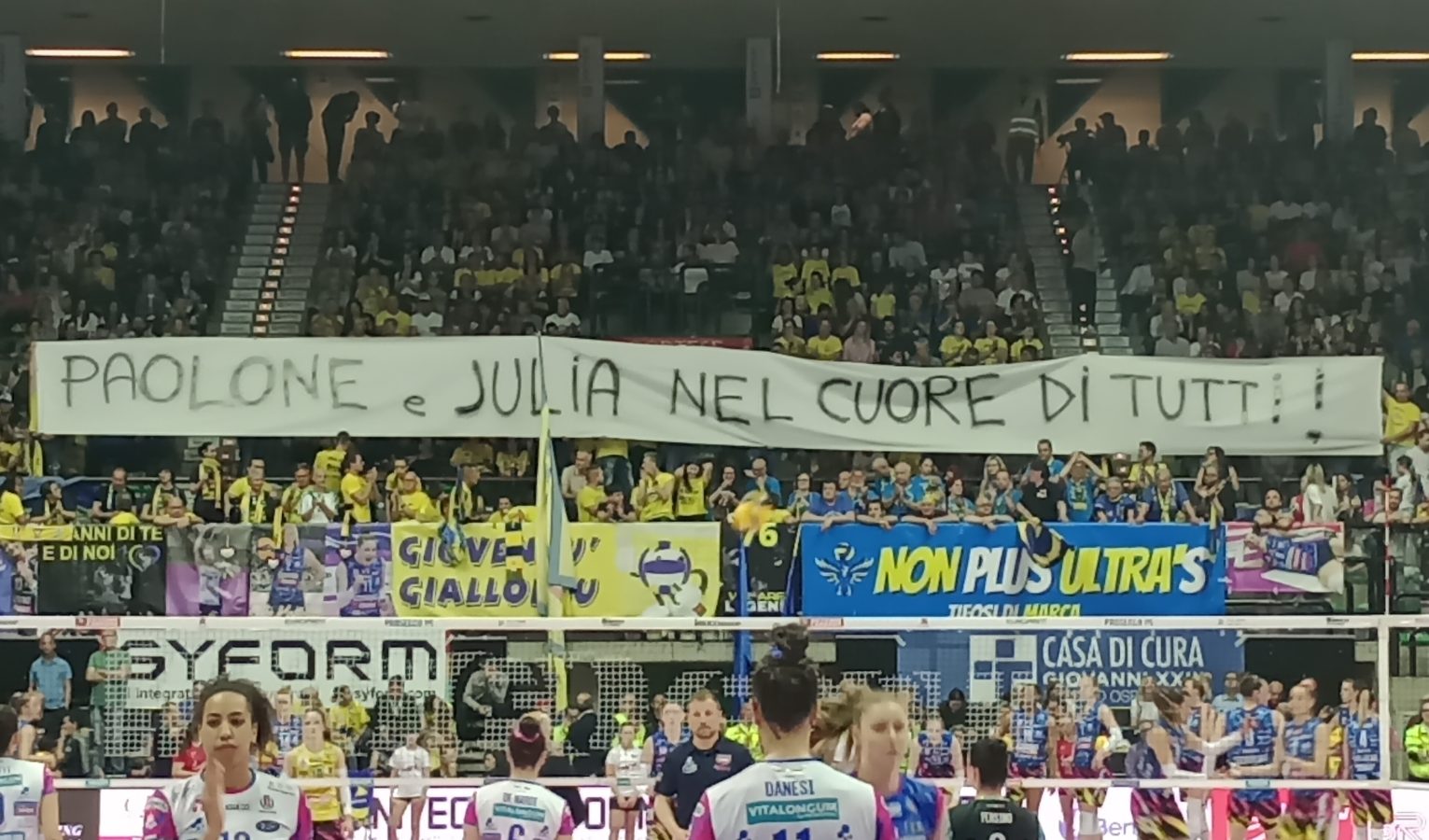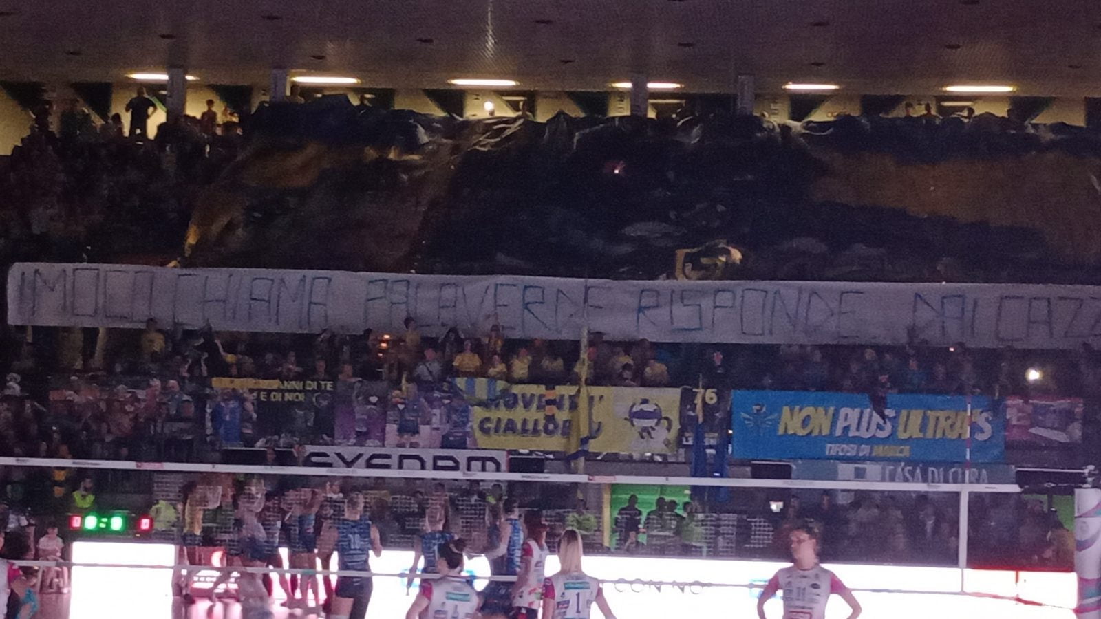 Visto che aveva pure portato bene, e soprattutto che le ragazze se lo meritano, la curva intona di nuovo “Vi vogliamo così” alle proprie beniamine, mentre lo speaker Luca Barzi invoca la “cazzimma”. Subito un errore marchiano di Szakmary dà il vantaggio alle pantere, che poi se lo riprendono murando Danesi. Su quest’azione Bernardi ha molto da dire (anche a gesti). Le sue ragazze, tuttavia, sono ben presenti a se stesse e all’obiettivo di serata, e trovano il +2, vantaggio ben presto annullato dalle pantere. Lubian delizia (ace) e croce (palla in rete) al servizio, indi dai 9 metri sbaglia anche Szakmary, segno che c’è forse un po’ di stanchezza sul rettangolo rosa. Un attacco di Fahr cade ben dentro il campo a pochi centimetri da Bernardi, il quale si brucia letteralmente un videocheck. “Fahr on fire”: muro imperiale e Mister Secolo ferma tutti. Apprezzabilissimo, dalla tribuna stampa, l’effetto del servizio di Markova, che purtroppo per lei e per l’Igor termina fuori. Tre punti di vantaggio Imoco a metà set, il momento del match è palesemente topico. Bernardi cambia la diagonale, Haak gli risponde salendo piani e schiacciando ad angolo quasi retto. Non passa in attacco Szakmary (19-15), Bernardi chiama l’ultimo time out del suo set e forse non solo, perché Robinson non sbaglia un diagonale (il servizio successivo sì). Bosetti manda in tribuna un pallone attaccato da Haak e forse lungo, nel palazzo non si fermano gli “alé alé oo-oh” ma Novara è “solo” a -3. Finta di corpo di Fahr, ne mancano tre alla vittoria. La coneglianese (di nascita) De Nardi entra per potenziare la seconda linea ospite ma Bosetti sbaglia in prima; Fahr affonda la flotta e i matchball sono ben cinque. Ancora Fahr ed è finalmente finale scudetto, mentre la Sud si erge di nuovo a protagonista issando un altro striscione dal tono sarcastico nei confronti di una nota pay tv (a gara finita, chiarimento e abbraccio tra commentatrice e tifoso).