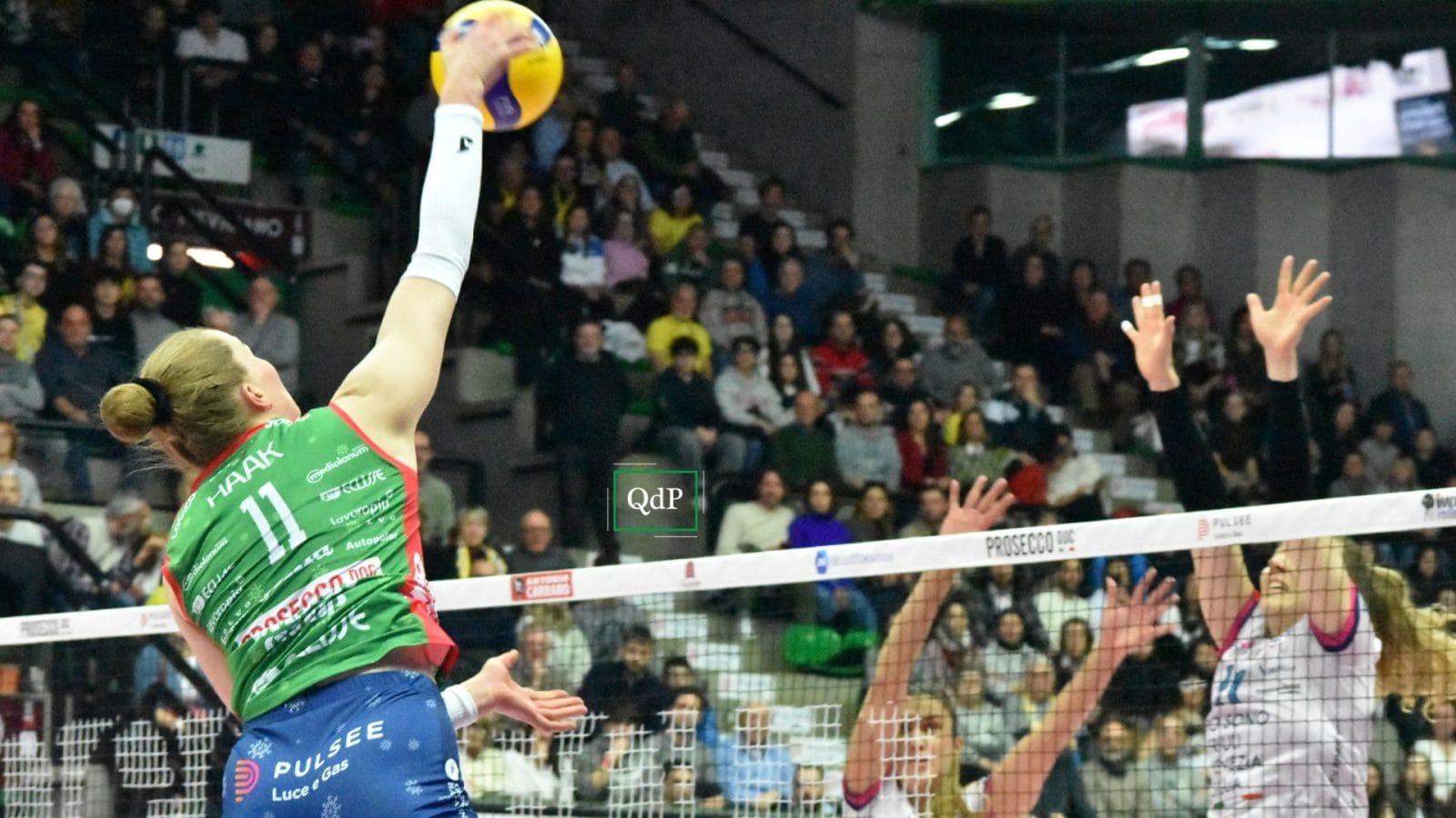 E’ una Talmassons ancora gagliarda quella che rientra in campo sotto la curva nord: per diversi minuti le ospiti rimangono avanti nel punteggio (7-3 dopo un video controllo). La forbice a favore delle friulane continua ad allargarsi, il “cubo” del Palaverde mostra parziali a cui il pubblico trevigiano non è abituato, ma pian piano le pantere rosicchiano punti e, con l’aiuto del videocheck, pareggiano a quota 10. I meccanismi gialloblù – pardon, verderossi – non sono ancora oliati alla perfezione, ma muri come quello di Lubian (14-14) rinvigoriscono ugole e speranze. Seki prende in mano la situazione e dà il +3 alle pantere: Barbieri allarga le braccia e convoca le ragazze nel suo angolo. Il set non è del tutto scontato, ma il vantaggio delle pantere è rassicurante al momento decisivo. Talmassons, tuttavia, non rinuncia mai a pungere, forse sognando quello “scherzetto” sfiorato nel set precedente. Ace di Storck, ma Santarelli – così come il collega oggi avversario – ha già finito i time out. Tocca allora a Lubian fare la voce grossa con un pallone “a chiodo”. Lanier sembra sparacchiare in tribuna e invece è brava a trovare il tocco friulano, che vale 6 setball. Non si soffre come l’altra volta: Haak chiude subito.