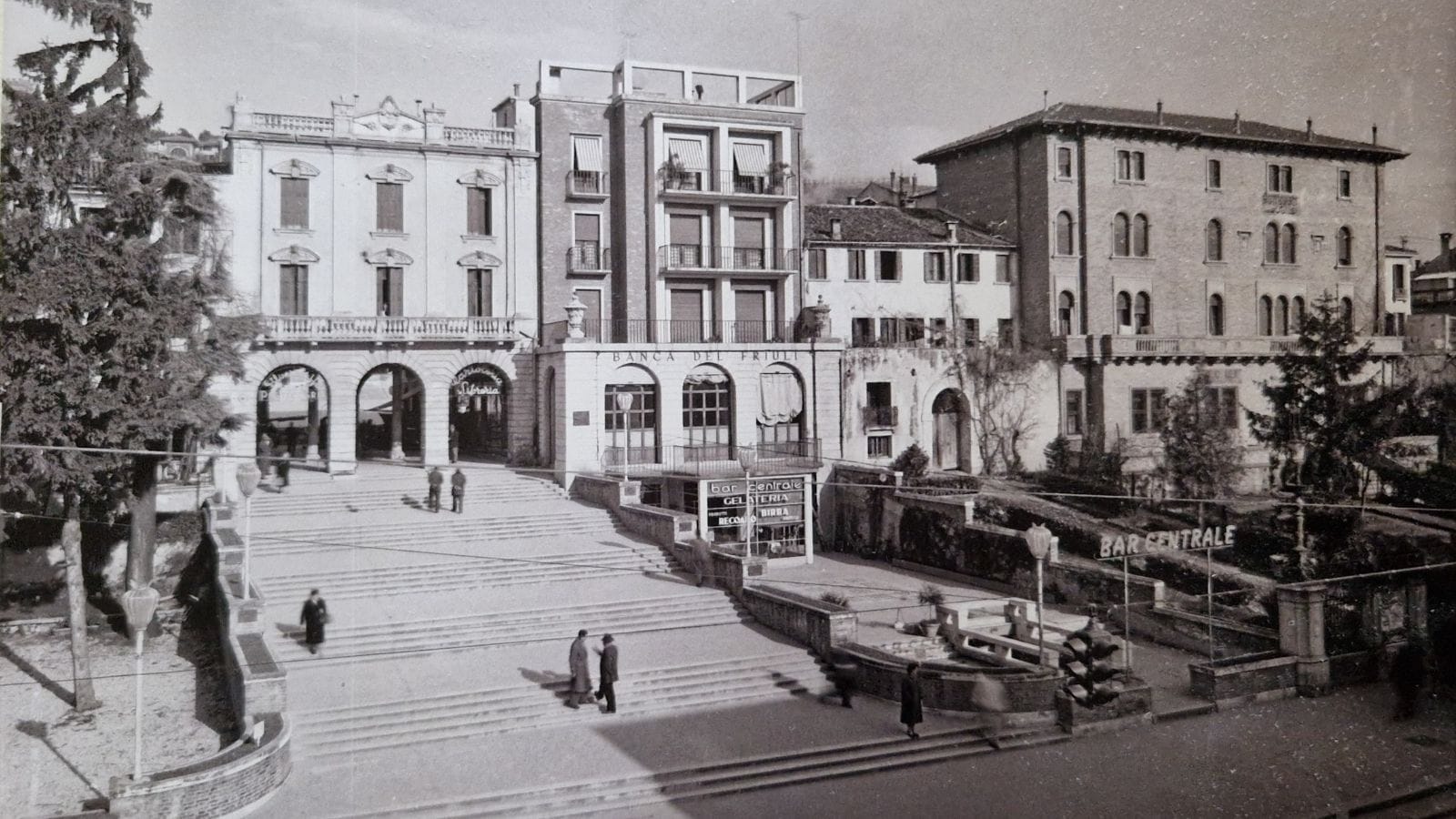 A lato della Gradinata, infatti, si nota il Bar centrale, con gelateria annessa, sovrastata dalla Banca del Friuli: realtà entrambe non più presenti in loco.