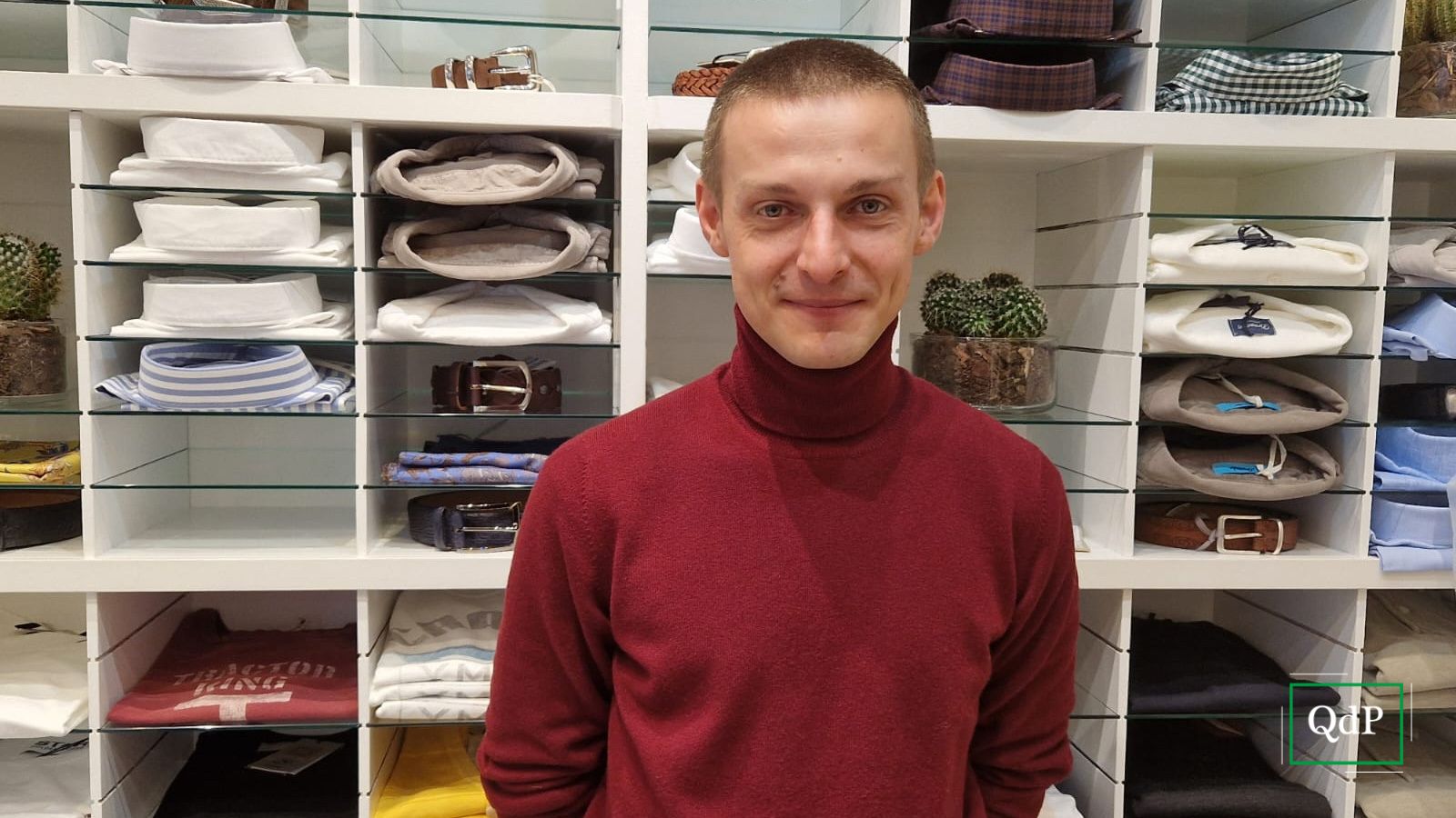 C’è affabilità nel modo di fare del 29enne, che emerge anche in un momento durante l’intervista, quando entra in negozio un cliente per provare una giacca: lì il giovane non si risparmia nel consigliare l’outfit migliore da sfoggiare, con netta semplicità e simpatia.