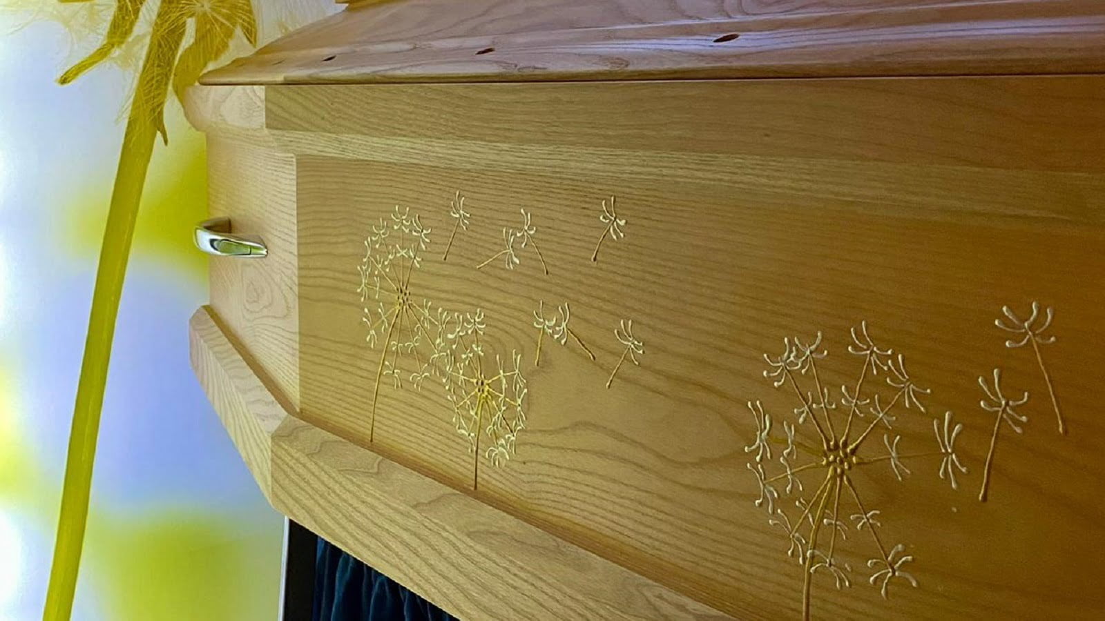 Sul fianco di un feretro sono stati infatti incisi dei soffioni, con dei petali in aria, grazie alla collaborazione con un artista locale, tramite una tecnica a rilievo.