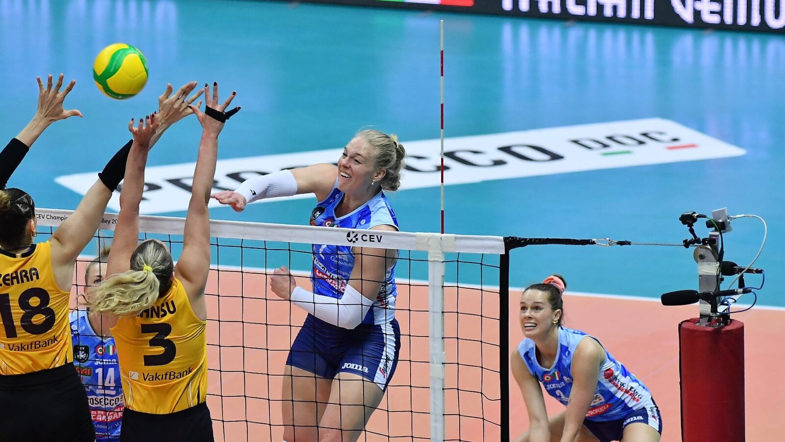Il terzo parziale è diventato così già potenzialmente decisivo ai fini della qualificazione, in quanto in Champions si guarda al quoziente punti e non a quello dei set, e quindi ai 3 punti ottenuti sul Bosforo si è sommato quello guadagnato sul taraflex amico, che ha reso le pantere irraggiungibili da Gabi (futura pantera) e compagne. Il 25-19 a favore delle campionesse d’Italia ha scatenato la gioia immensa dei tifosi, che in più di 5 mila hanno reso incandescente il Palaverde nonostante l’orario non favorevole per chi lavora (le 18.30 di un giovedì feriale). Nelle fila delle ospiti da segnalare, dopo la metà del terzo parziale, l’infortunio al libero titolare Aykac che ha costretto Guidetti al cambio forzato.