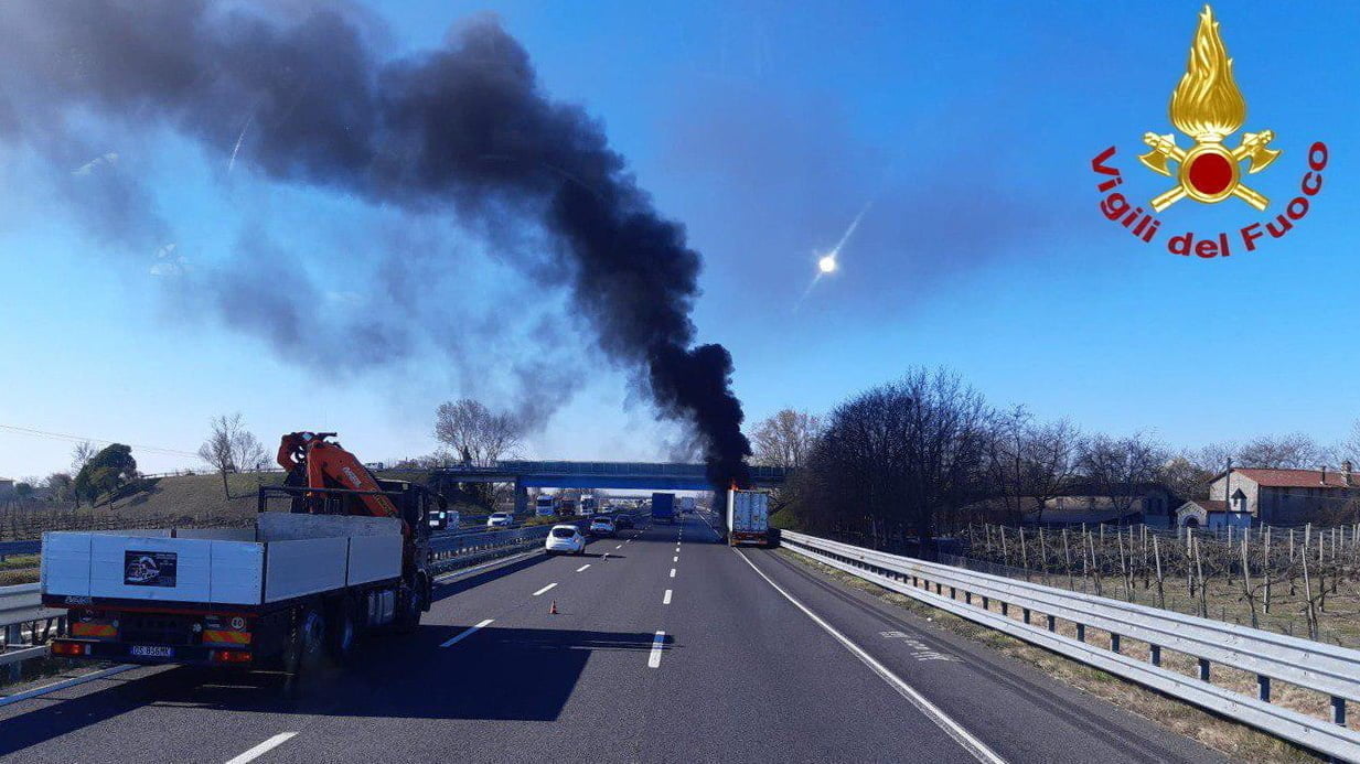 Tir in fiamme in A27 fra Conegliano e Treviso: la colonna di fumo visibile a grande distanza