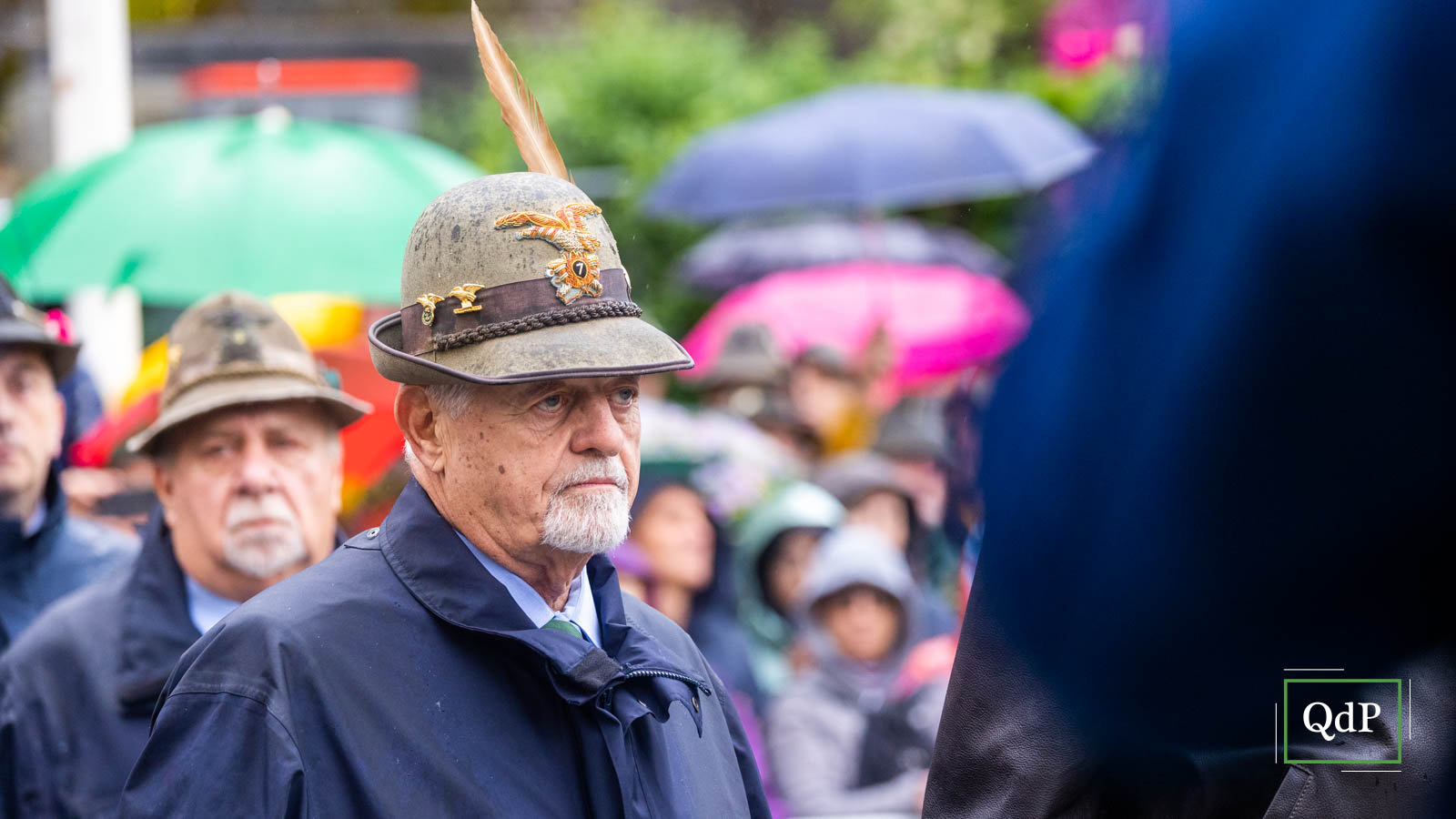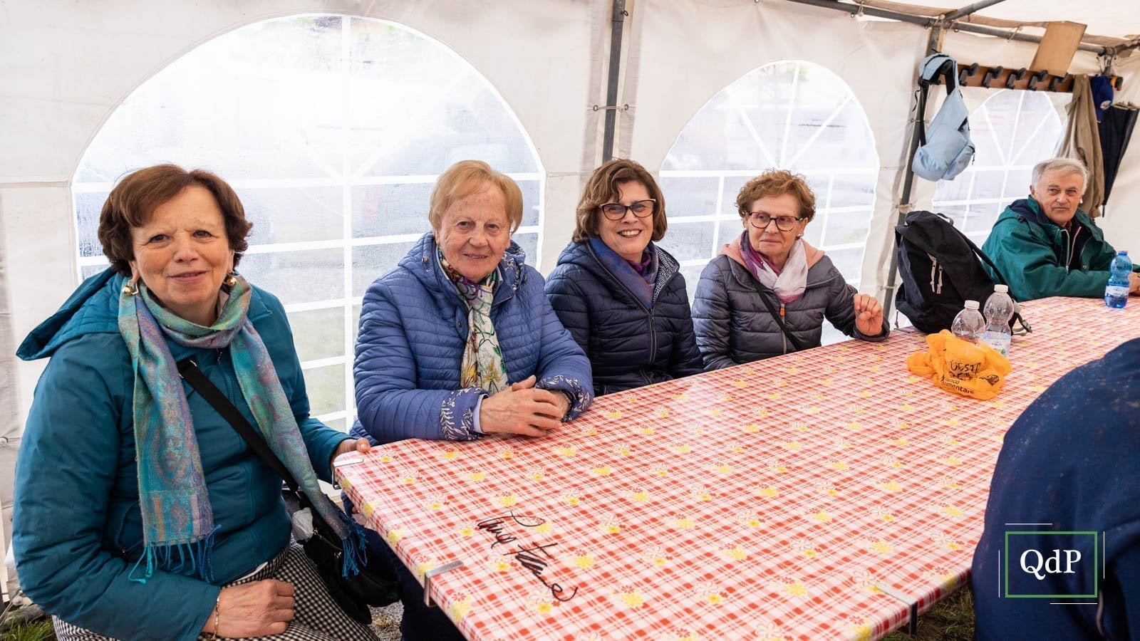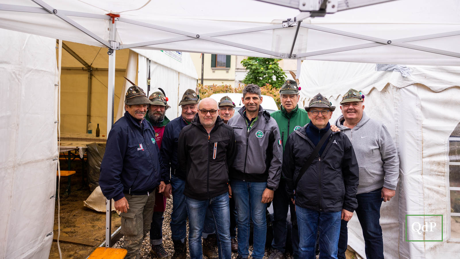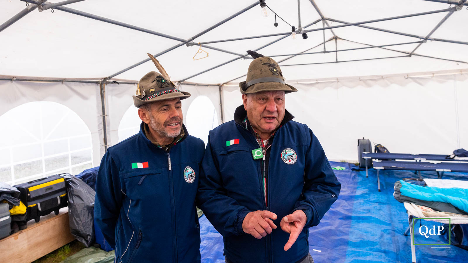 Pur di stare all’adunata, per esempio, i Gruppi Alpini di Refrontolo, Pieve di Soligo, Conegliano, ma anche alcuni dai gruppi della Vallata, come Cison, Follina, Tarzo, Revine Lago, hanno chiesto di potersi accampare in un’area esterna di un ex-monastero non lontana da Piazza I Maggio. “Toglietevi le scarpe prima di entrare” ci dicono scherzando da dentro il tendone, dove il pavimento è letteralmente una vasca di fango.