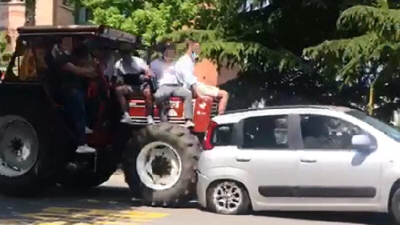 La scena è stata immortalata nel video di un passante, poi pubblicato sui social: nel filmato si vede come sul cofano del trattore fossero seduti diversi ragazzi e proprio questo fatto avrebbe impedito la visuale al guidatore, il quale ha tamponato la Fiat Panda che, nel frattempo, si trovava ferma poco prima del semaforo.
