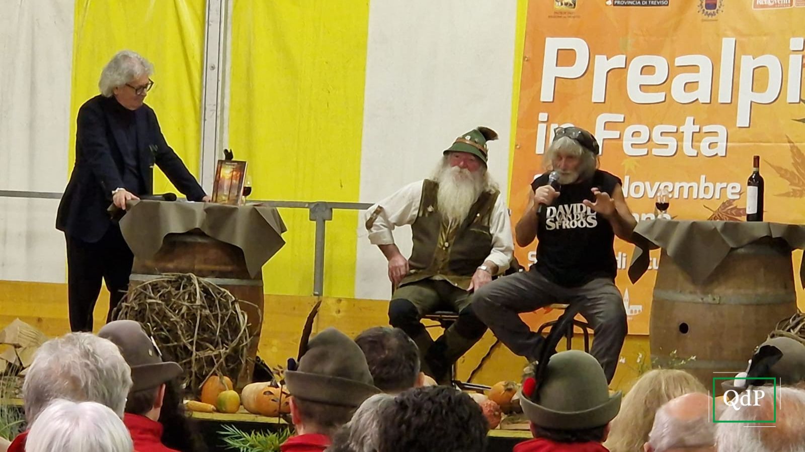 Mauro Corona (col microfono) nel 2023 a Cordignano in occasione di “Prealpi in festa” accanto all’amico “Poiana”