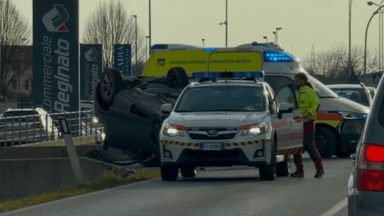 Auto finisce ruote all’aria davanti al concessionario: feriti padre e figlio