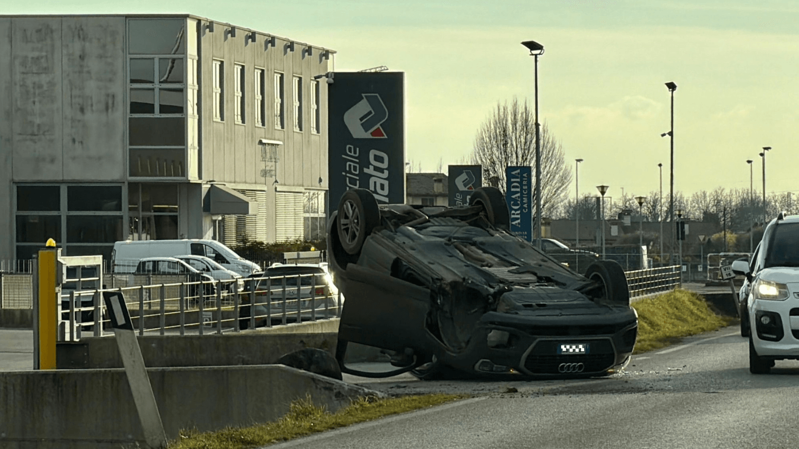 Auto finisce ruote all’aria davanti al concessionario: feriti padre e figlio