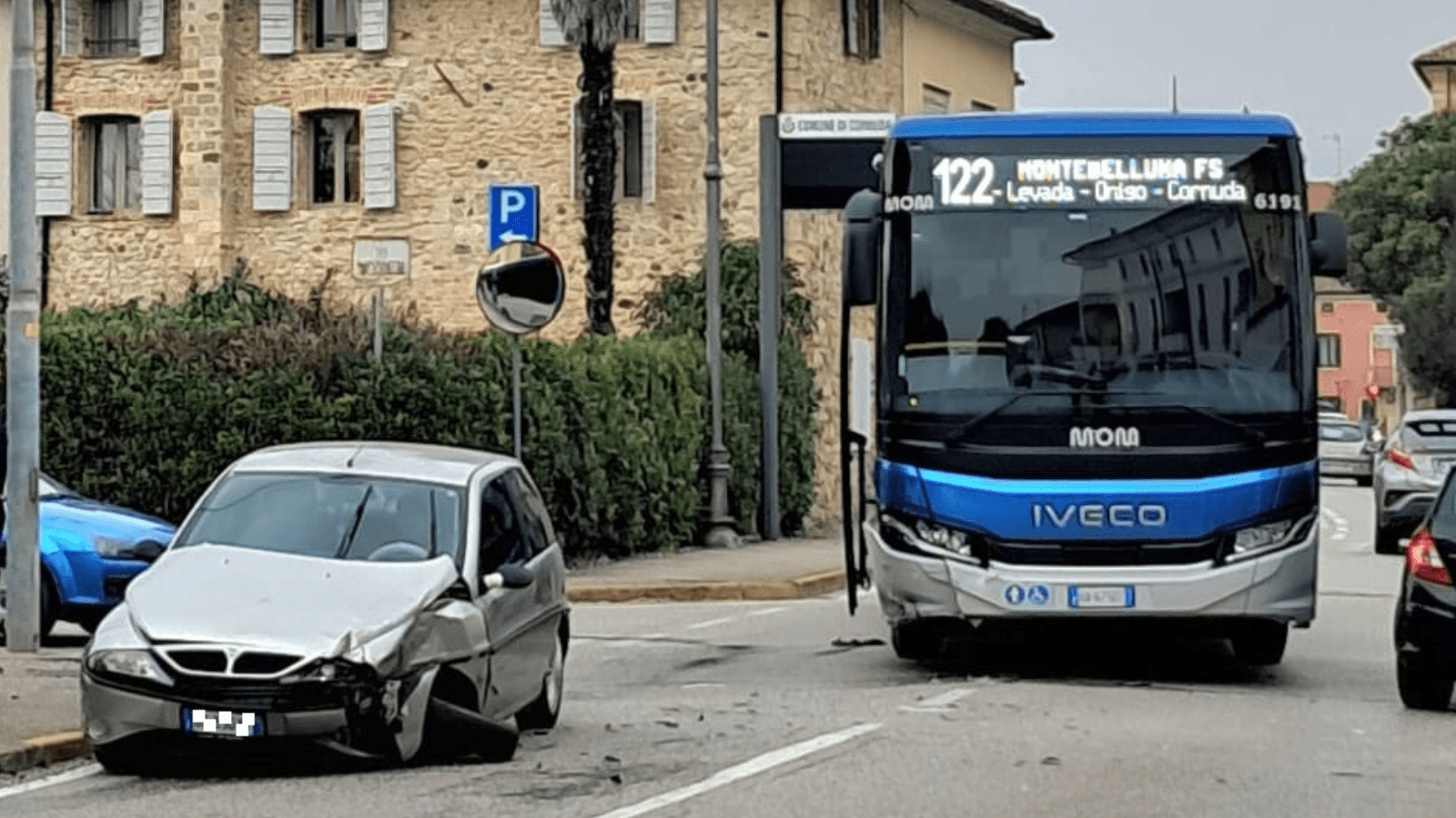 A scontrarsi in via Zanini, per cause in corso di accertamento, un bus Mom della linea 122 (Montebelluna-Levada-Onigo-Cornuda), e un’auto, una Lancia Ypsilon grigia.