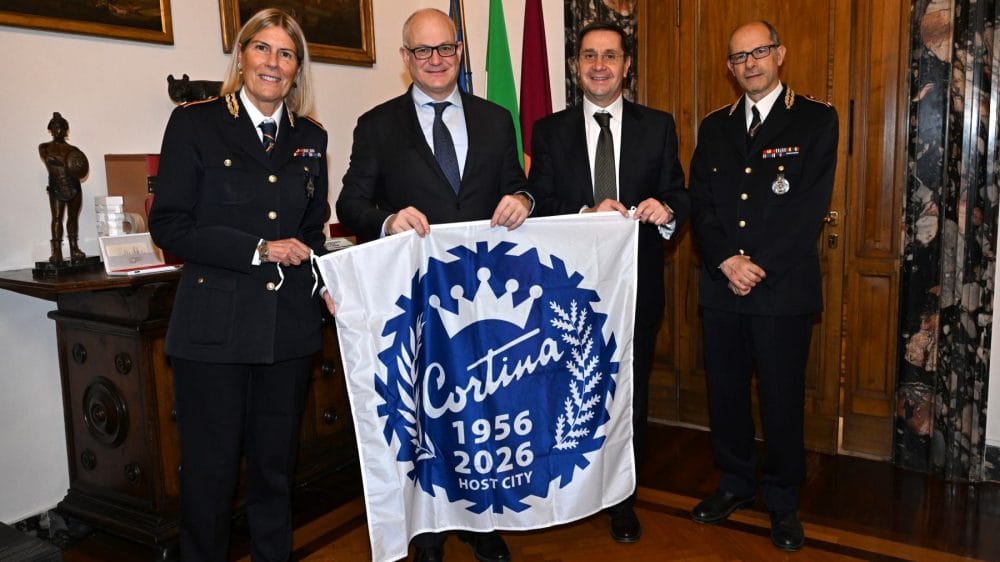 della visita, Lorenzi ha donato al collega Gualtieri la bandiera dei Giochi “1956–2026”, simbolo del ponte tra l’eredità olimpica di Cortina e il percorso verso Milano Cortina 2026.