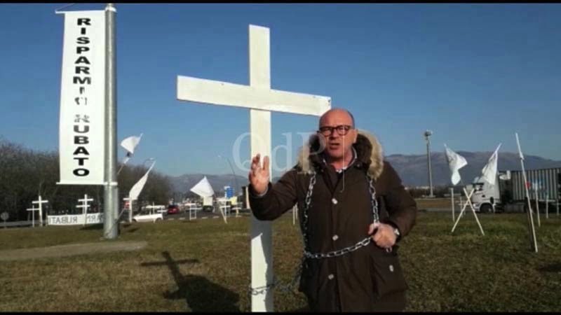 Proprio cento croci bianche, non una di meno, con un lumino acceso a memoria dei suicidi causati dal crack delle banche venete. E oggi Susin, artigiano locale, si è incatenato e ha distribuito volantini ai numerosi automobilisti in transito.