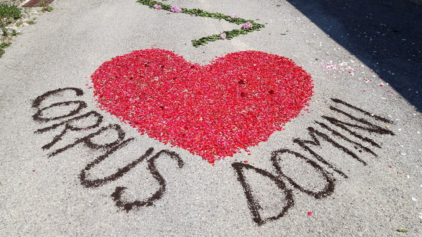 Così, al termine della Processione Eucaristica della mattina, partita dalla Chiesuola di Santa Maria Nova e diretta alla Chiesa parrocchiale, alcuni giovani della parrocchia avevano preparato anche quest’anno una piccola “infiorata”, decorando il manto stradale di via Chiesa con diversi quadri e decori floreali.