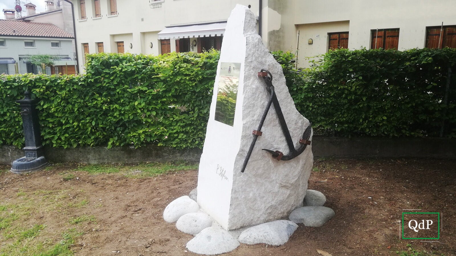 L’evocativo monumento in pietra rappresenta una nave che affonda, circondata alla base da grossi sassi recuperati dal greto del Piave, accompagnato da un’ancora asburgica proveniente dai fondali di Chioggia, recuperata dai pescatori e donata dal comandante della Marina Oscar Nalesso.