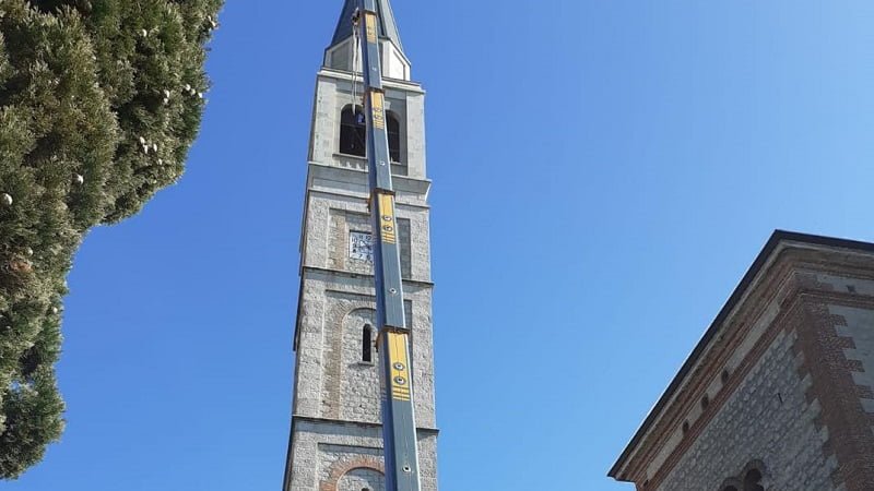 Il braccio meccanico di una gru ha calato a terra, dalla cima del campanile, le quattro campane. Il parroco, don Carlo Maccari, ha fatto sapere che la scenografica “discesa” delle campane è avvenuta perché necessitano di essere restaurate da una ditta specializzata di Legnaro, in provincia di Padova.