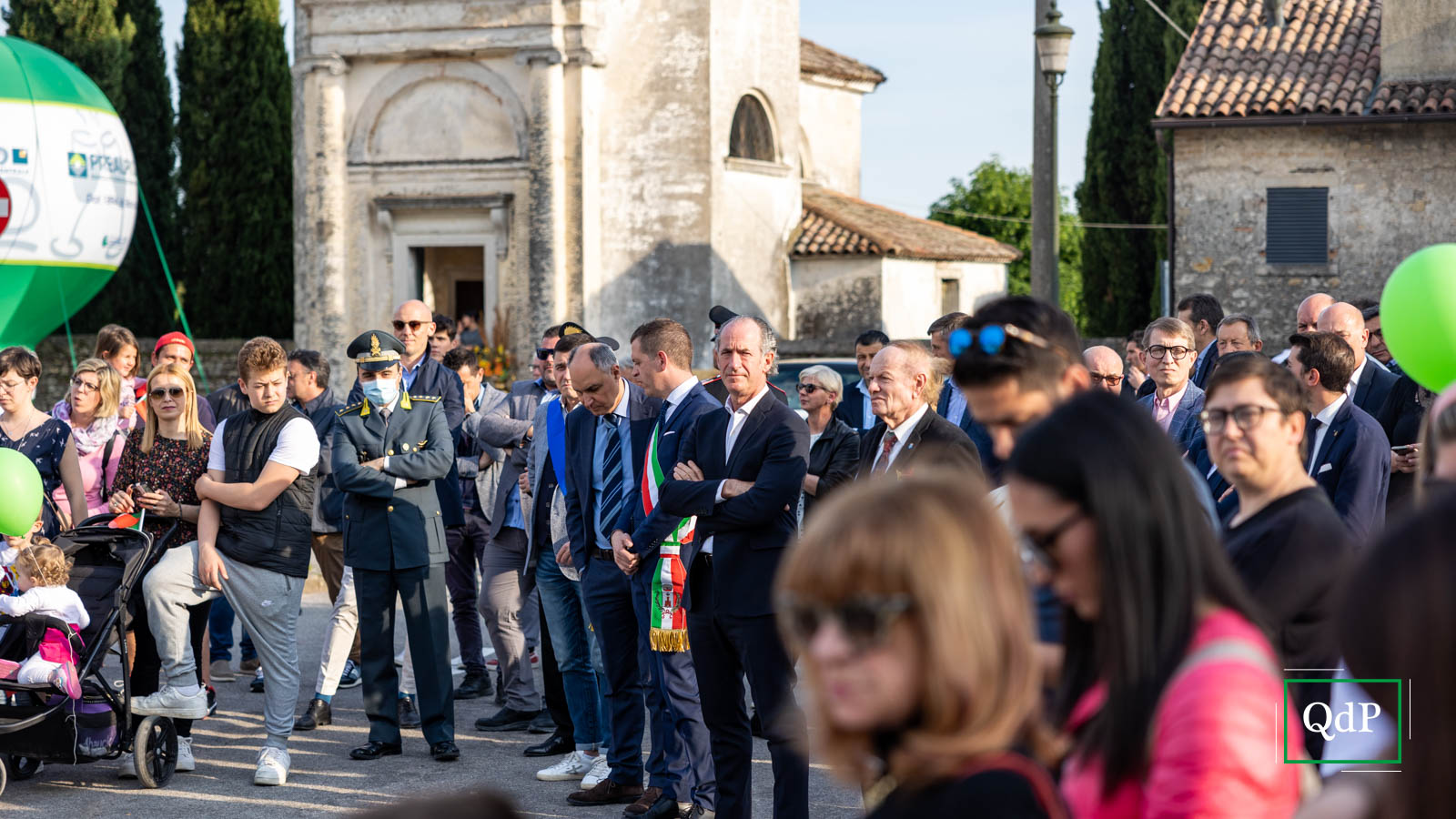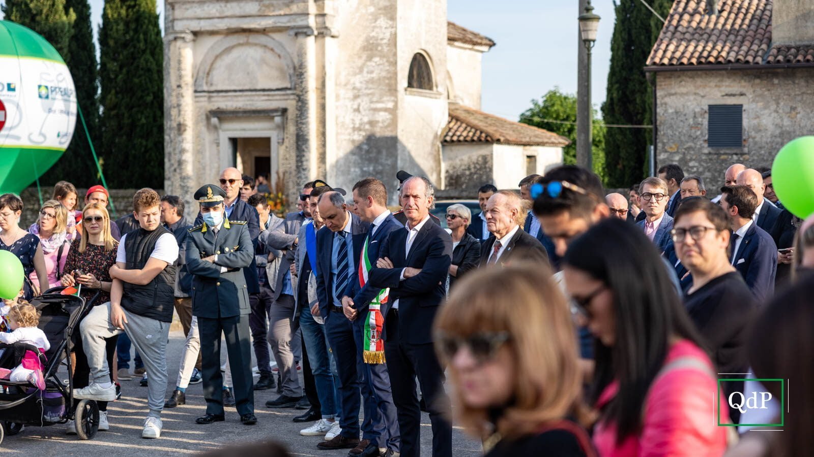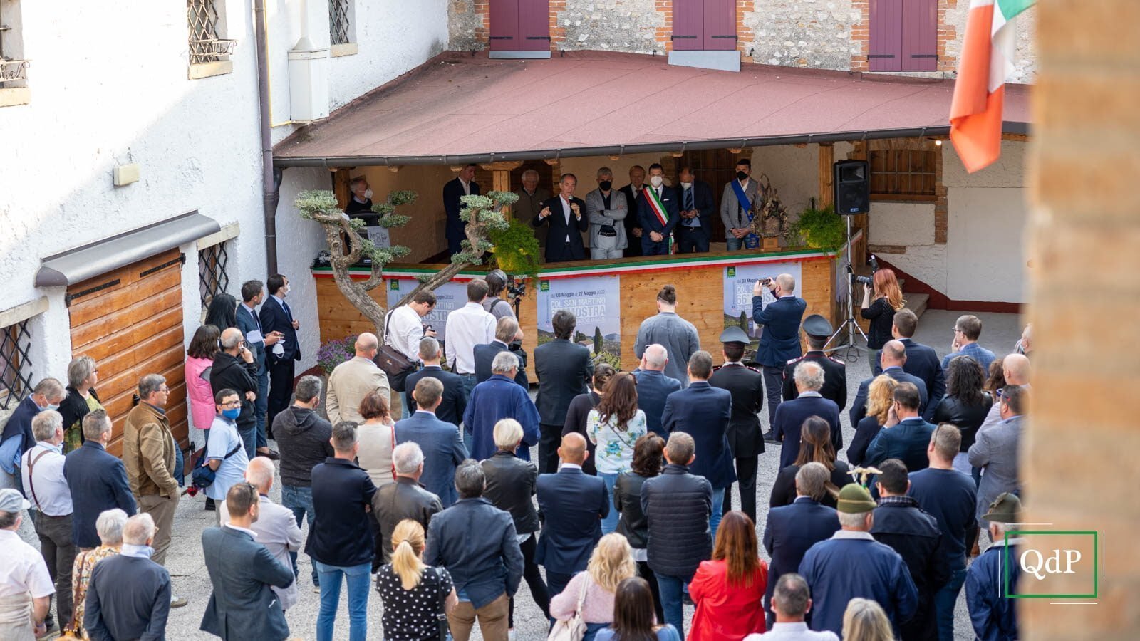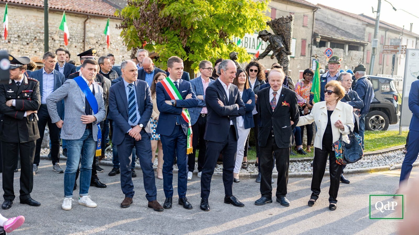 Palloncini verdi e bianchi in piazza Rovere a Col San Martino, la banda di Moriago della Battaglia schierata con le uniformi rosse e gli strumenti ben lucidati, i bambini irrequieti che attendono il momento giusto per iniziare a cantare l’Inno di Mameli. Poco più in là, anche gli ospiti della casa di riposo Botteselle attendono l’inizio delle celebrazioni, seduti in cortile. Ai margini della provinciale si incontrano sindaci, assessori e autorità del territorio, oltre al presidente della Regione Luca Zaia, che presenzia alla Mostra del Valdobbiadene Docg dal ‘95.