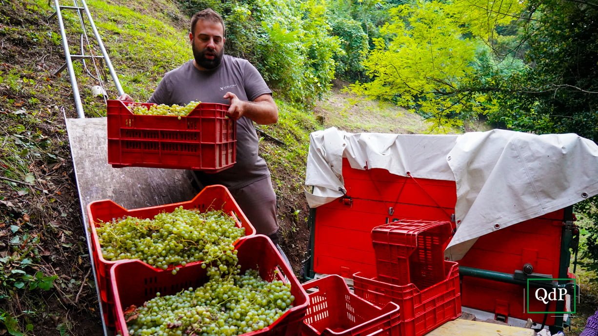 “Su questi pendii, inizialmente tutto veniva fatto a mano, dalla fertilizzazione allo sfalcio dell’erba, una fatica inimmaginabile. Mio nonno portava, attraverso un sentiero, il letame in spalla, nella “gerla” fino all’apice della riva – continua Guizzo – lascio a voi immaginare lo sforzo necessario. La vendemmia veniva fatta allo stesso modo, l’uva veniva portata giù a mano e in spalla. Da circa 5 anni abbiamo deciso di costruire un sistema che riesce a semplificarci un po’ la vendemmia”.
