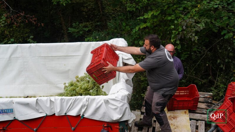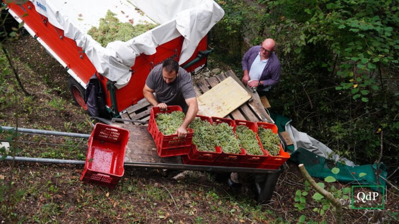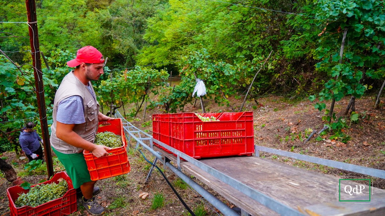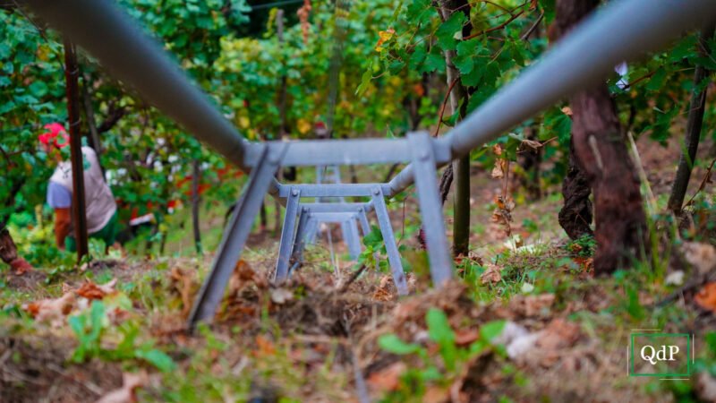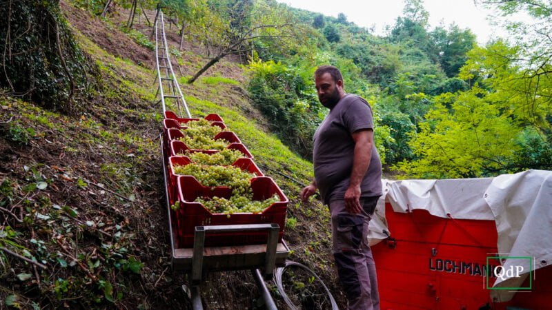 “Su questi pendii, inizialmente tutto veniva fatto a mano, dalla fertilizzazione allo sfalcio dell’erba, una fatica inimmaginabile. Mio nonno portava, attraverso un sentiero, il letame in spalla, nella “gerla” fino all’apice della riva – continua Guizzo – lascio a voi immaginare lo sforzo necessario. La vendemmia veniva fatta allo stesso modo, l’uva veniva portata giù a mano e in spalla. Da circa 5 anni abbiamo deciso di costruire un sistema che riesce a semplificarci un po’ la vendemmia”.