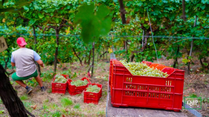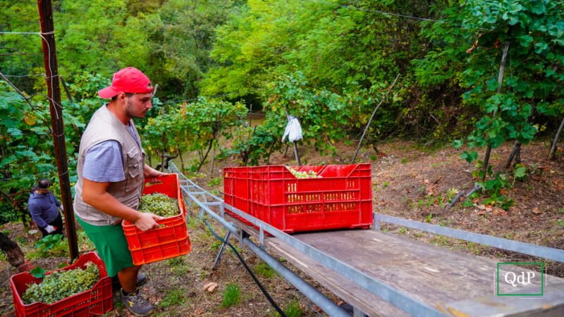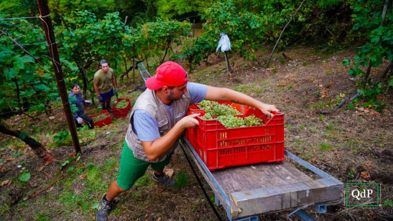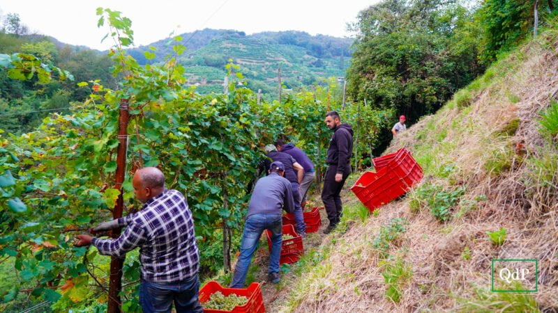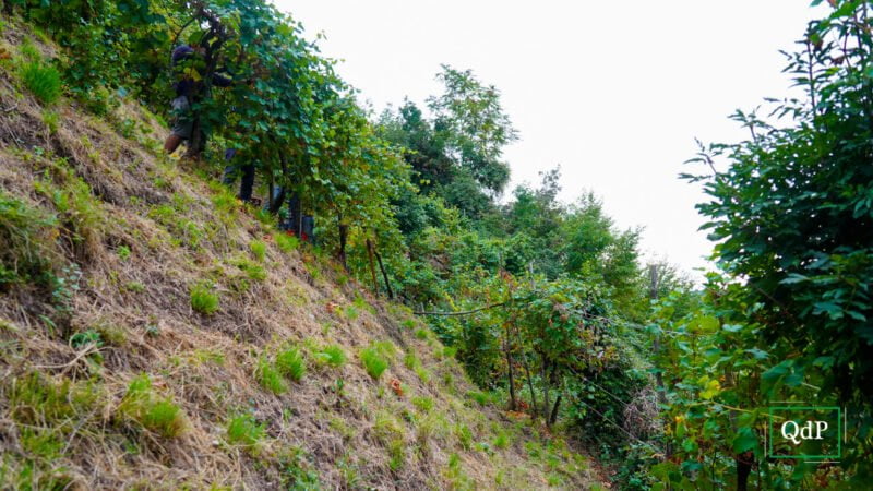 Una vendemmia propriamente eroica, perché su queste pendenze l’equilibrio è precario: per passare tra un filare e l’altro, ci si arrampica letteralmente sul pendio, a volte le gambe non bastano e ci si appiglia anche con le mani.