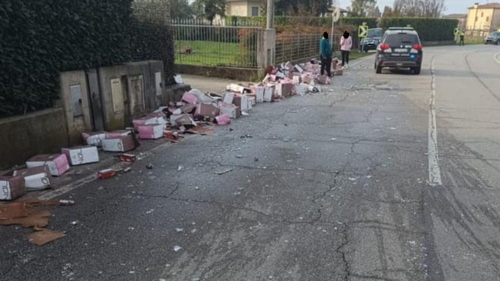 Tutto è accaduto verso le 8.45 di questa mattina: un mezzo che stava percorrendo via Brigata Mazzini, a Col San Martino (territorio del Comune di Farra di Soligo), ha perso parte del carico che stava trasportando.