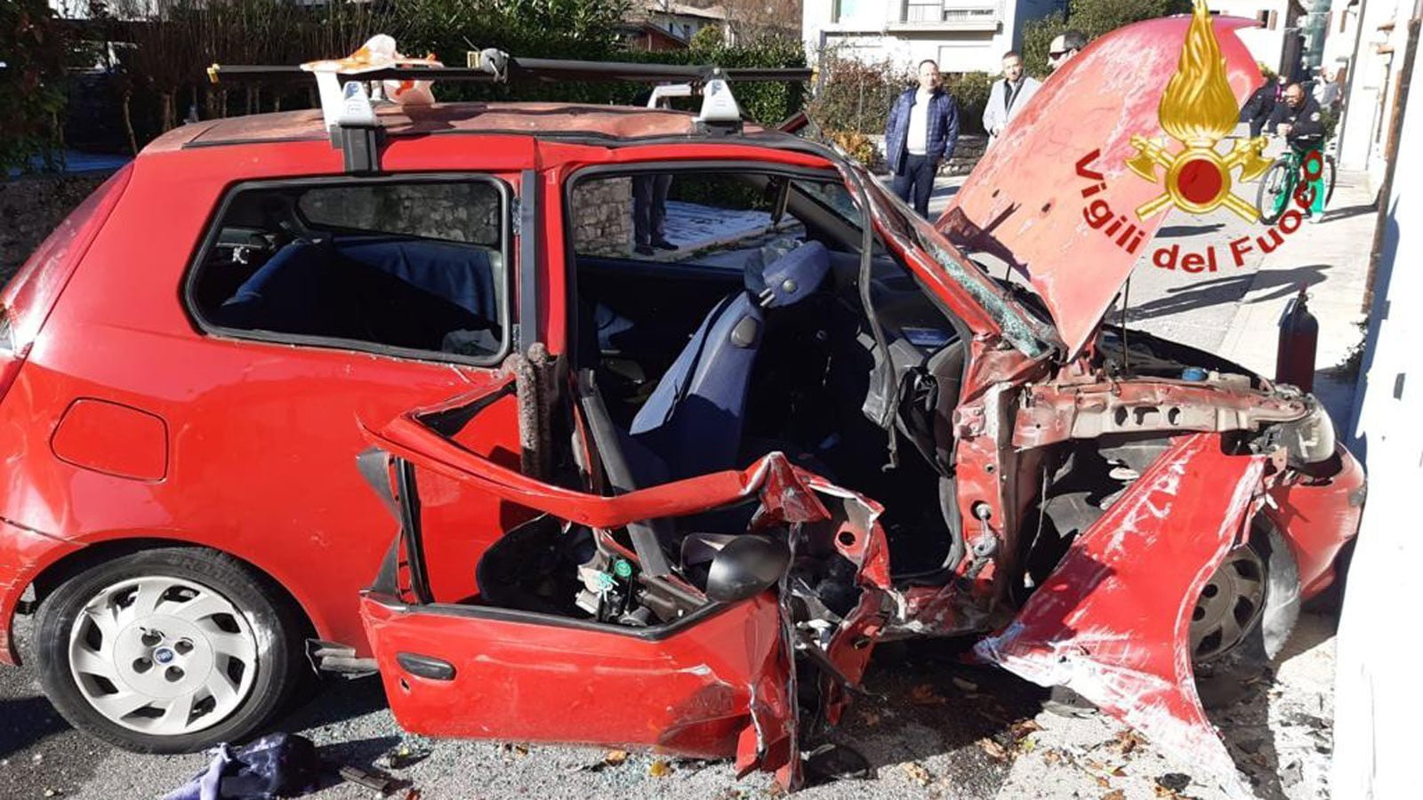 Domenica di preoccupazione oggi, 27 novembre, a Follina: una Fiat Punto rossa vecchio modello con cinque giovani a bordo è andata ad impattare violentemente contro una casa.