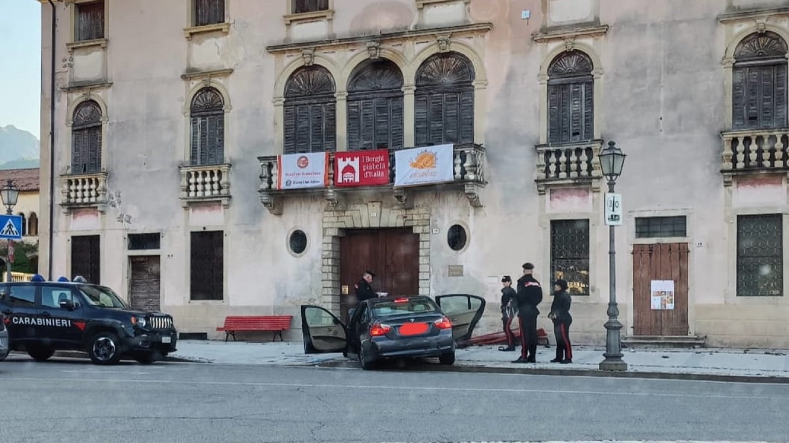 Alle 7 circa un’auto, una Bmw serie 3, proveniente da Miane, è andata ad impattare contro palazzo Barberis dopo aver abbattuto una panchina.