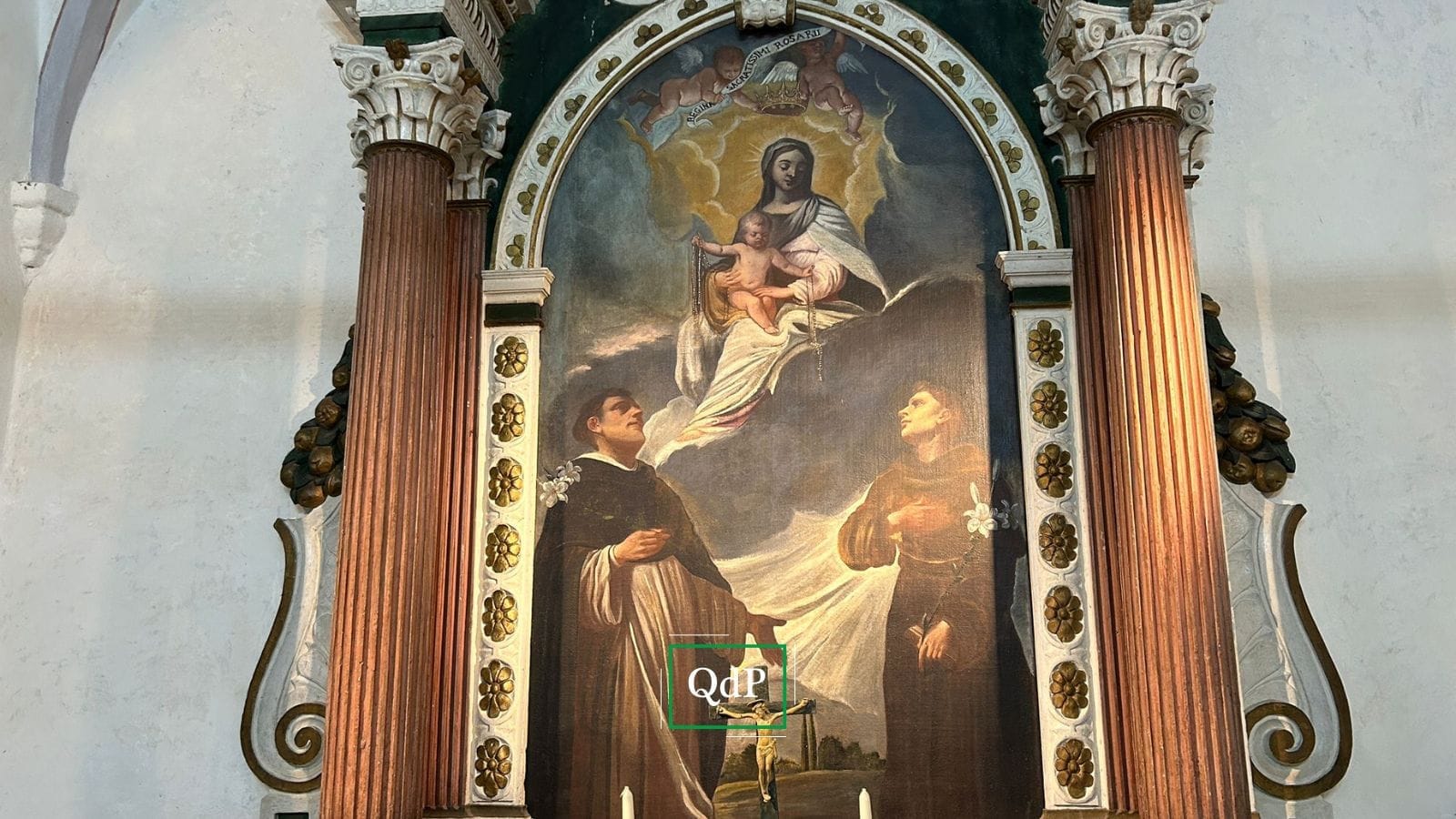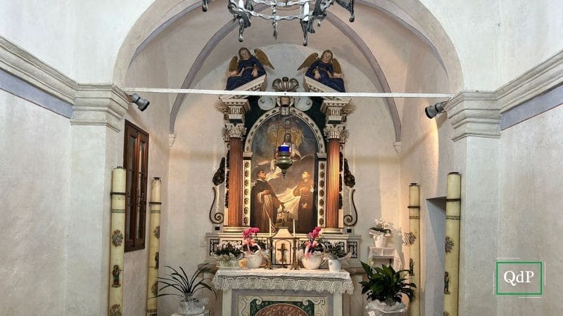 “A tale ipotesi – si legge in una nota storica dell’A.D. MMIX, addì 11 ottobre (Nel giorno di presentazione dell’opera restaurata) – rimandano la fascia violacea dipinta sulle pareti, ripresa con il turchese nel restauro, e l’immagine di Sant’Antonio, santo taumaturgo per antonomasia, rappresentato con San Domenico ai piedi della Vergine del Rosario nella pregevole pala dell’altare. Quest’opera, ora restituita al primitivo splendore, è stilisticamente attribuibile alla seconda metà del Settecento. Per quanto riguarda l’altare, invece, le tracce di doratura rilevate al di sotto della sua elegante policromia, ne suggeriscono la collocazione negli ultimi decenni del Seicento”.