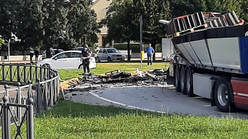 Blocchi di cemento cadono dal camion alla rotatoria di via Ungheresca a Ramera: traffico in tilt